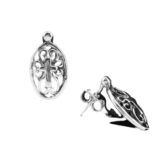 Sterling Silver .925 POST Earrings 8mmx20mm Oval shape filigree w cross