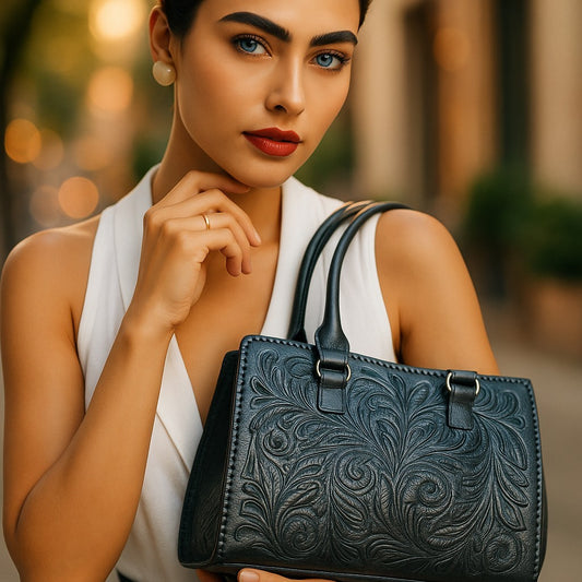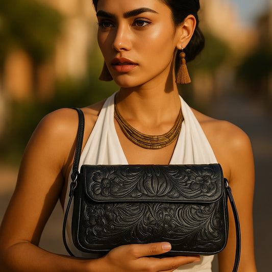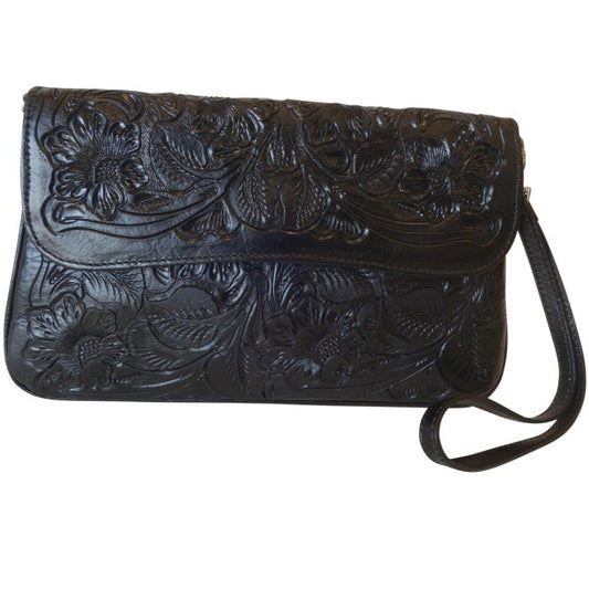 GRANADA Handtooled Leather Handbag Black Color 10"x6"x1"