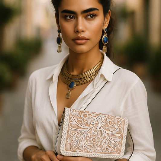XALAPA Handtooled Leather Handbag 14"x12"5" Cafe Color