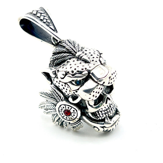925 Silver Pendant Jaguar Warrior Skull with Garnet