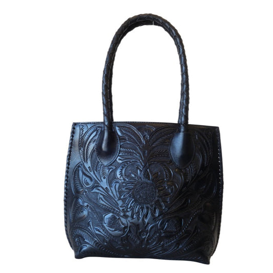 GRANADA Handtooled Leather Handbag Black Color 10"x6"x1"