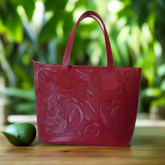 CHICHENITZA Handtooled Leather Handbag 16.5x7x12 Red Color