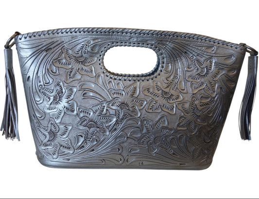 BECAN 17"x4"x11" Silver Color Handtooled Leather Handbag