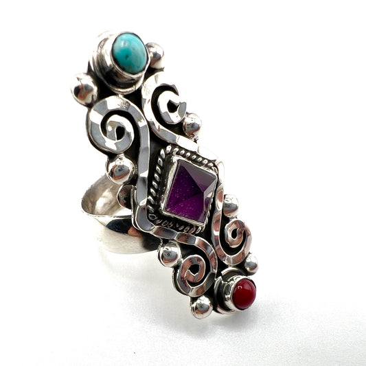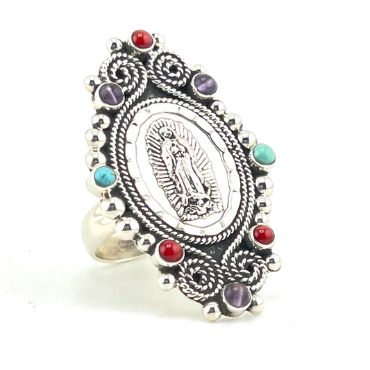 Size 7.5 silver ring with virgin adorned with coral turquoise amethyst