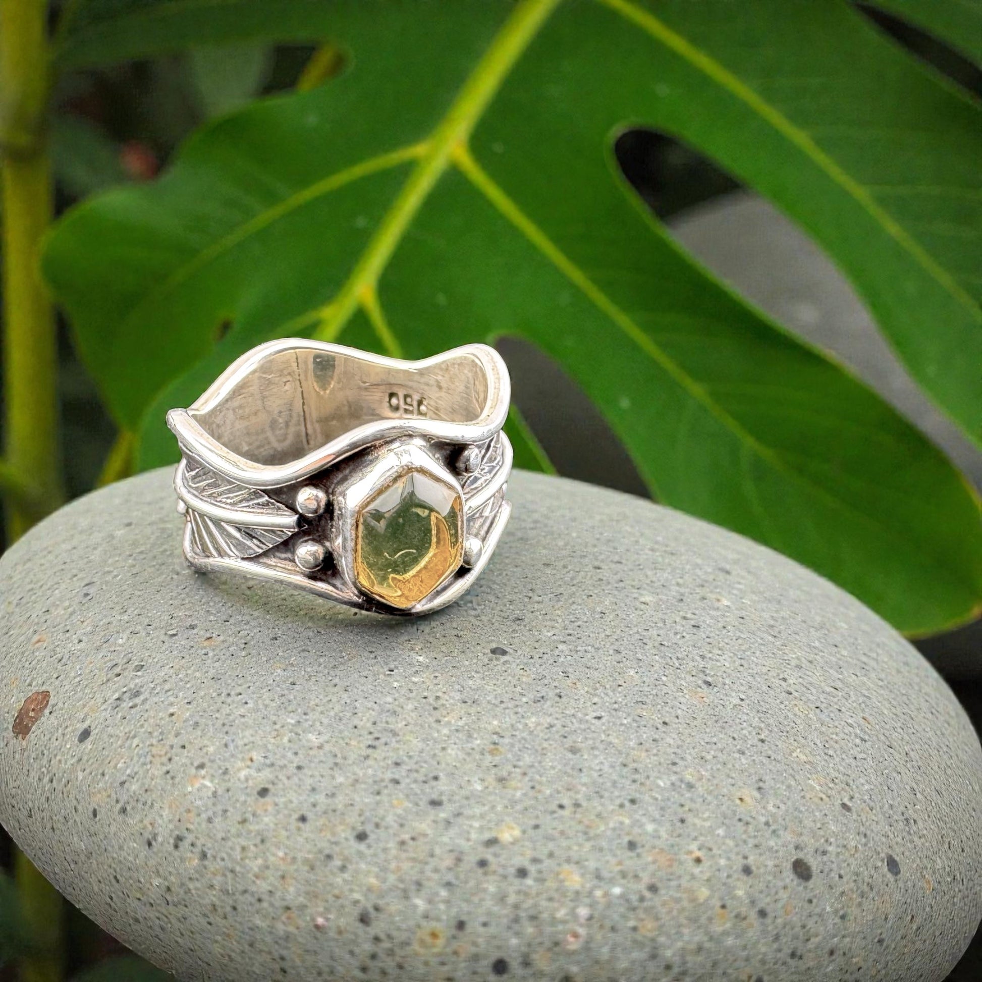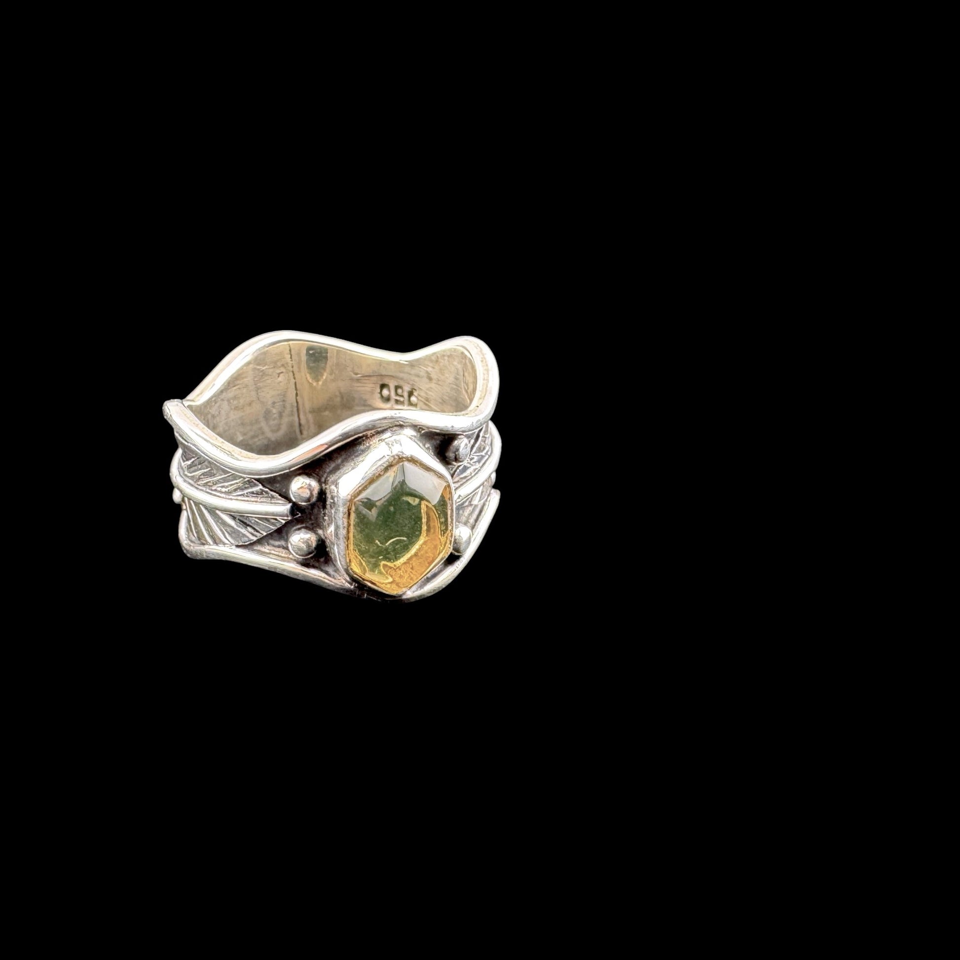 Size 7.5 Hexagonal Amber Ring with detailed 950 silver work, Ambar Hexag, Artisan crafted sterling silver. ASC2-R035-075
