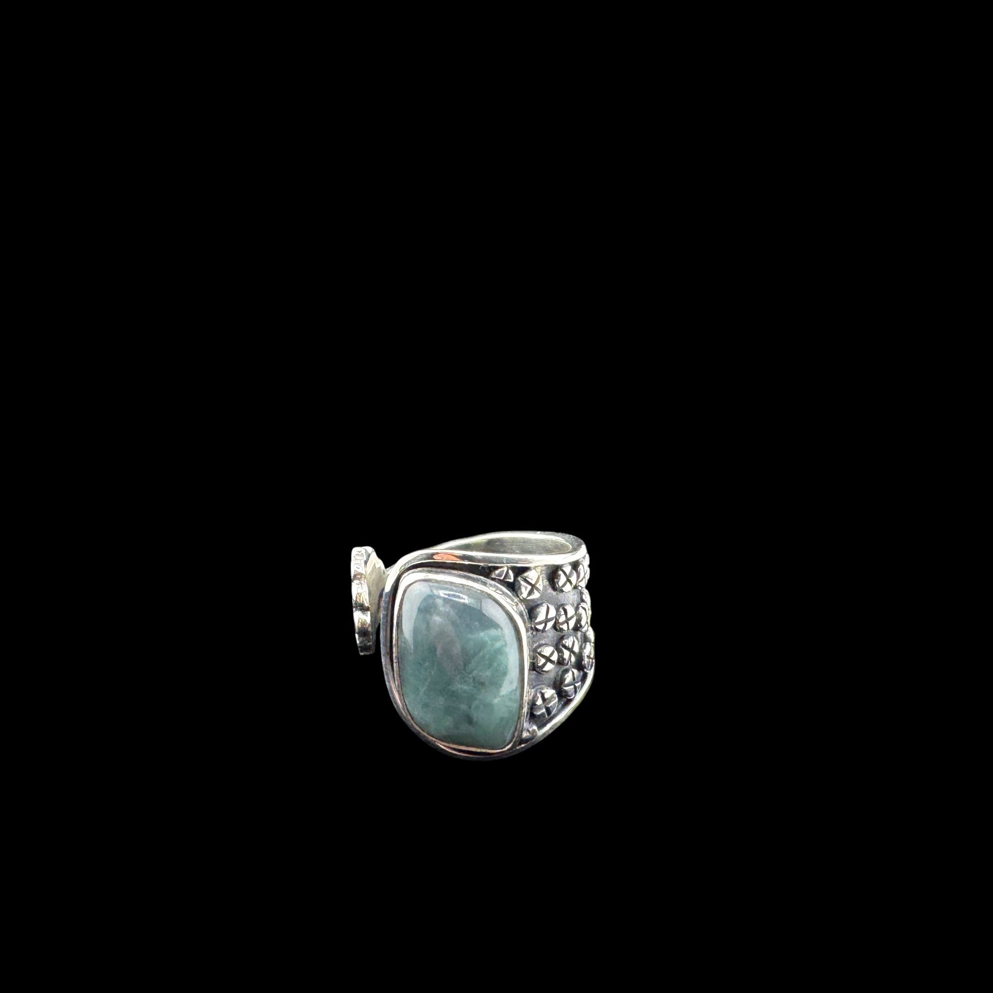 Size 8 Blue Jade Ring with detailed 950 silver work, Jade Azul, Artisan crafted sterling silver. ASC2-R046-080