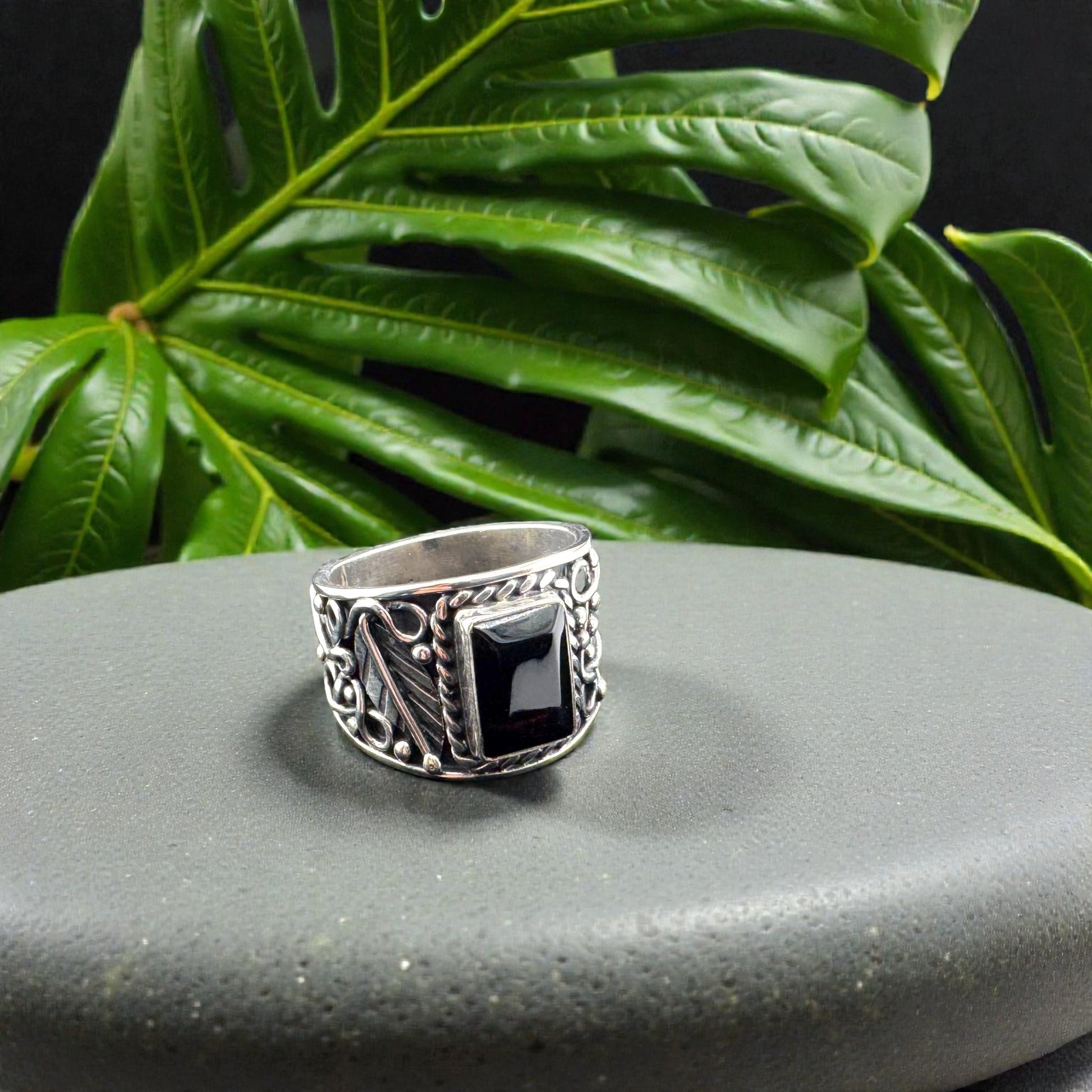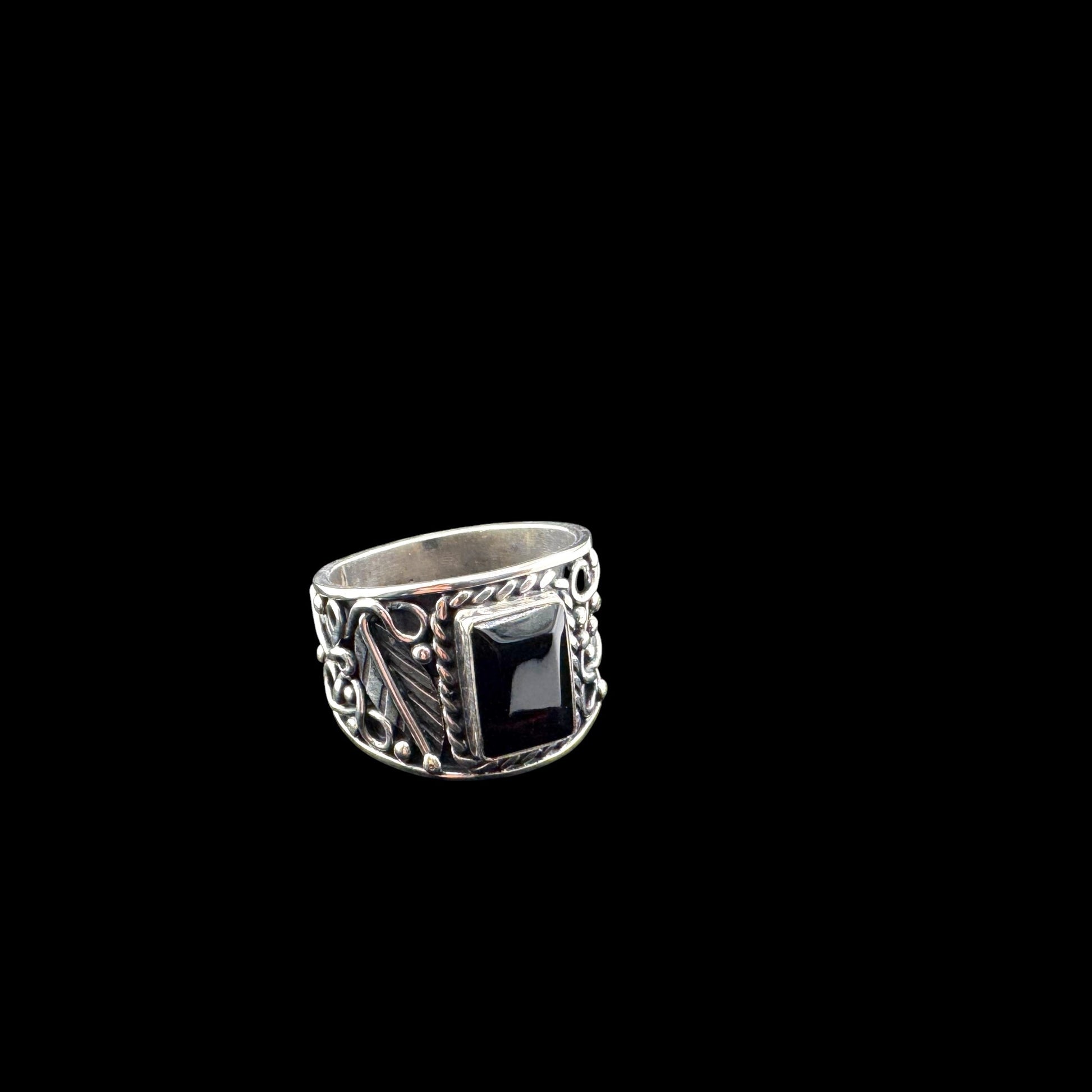 Size 10 Rectangular Dark Amber Ring with detailed 950 silver work, Ambar Rect Oscuro, Artisan crafted sterling silver. ASC2-R047-100