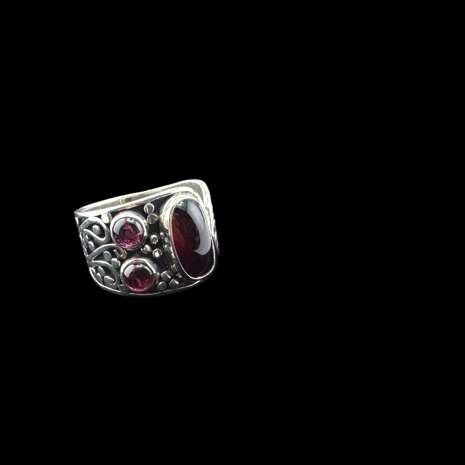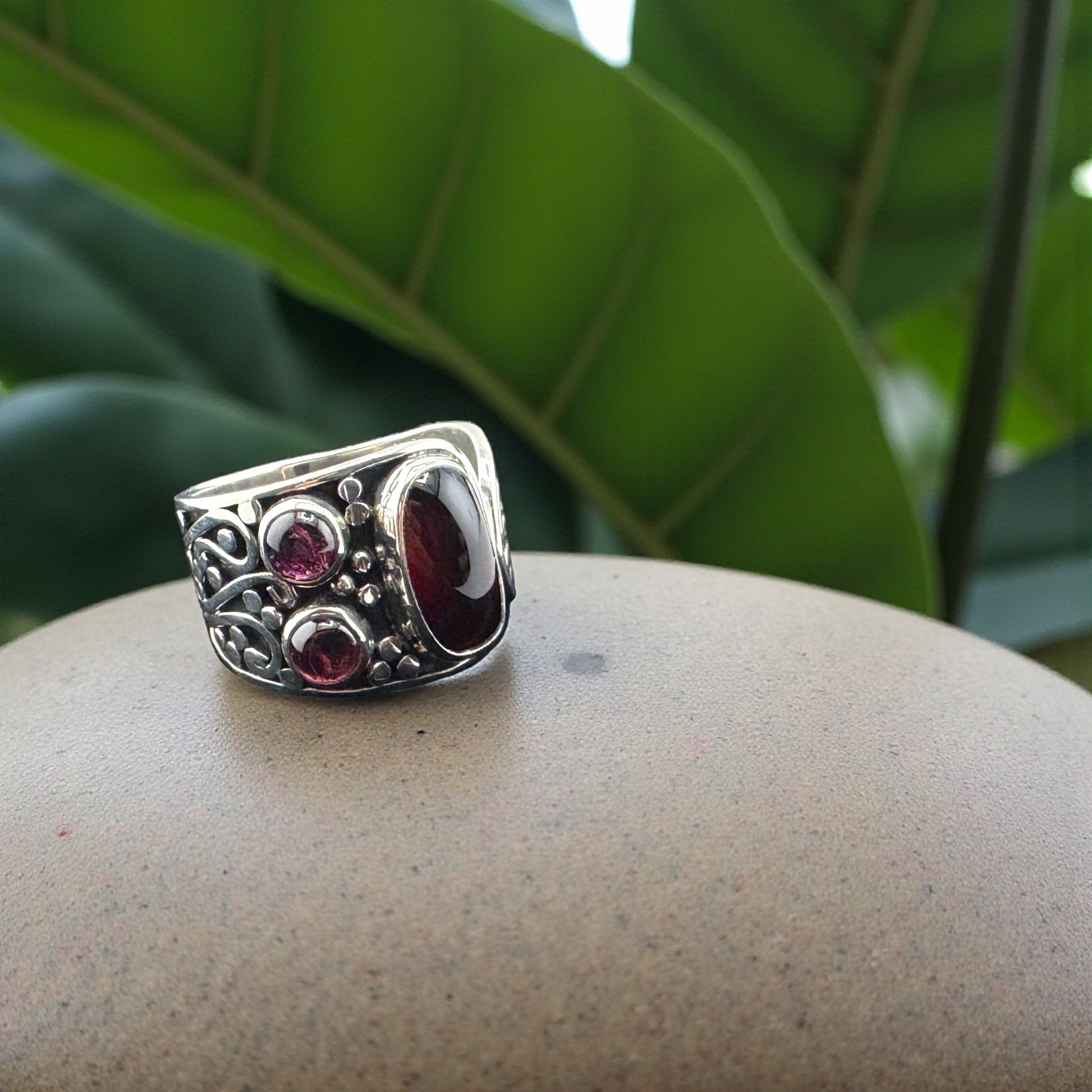Size 10 Red Amber 3 stones, with detailed 950 silver work, Ambar Rojo Tres, Artisan crafted sterling silver. ASC2-R061-100