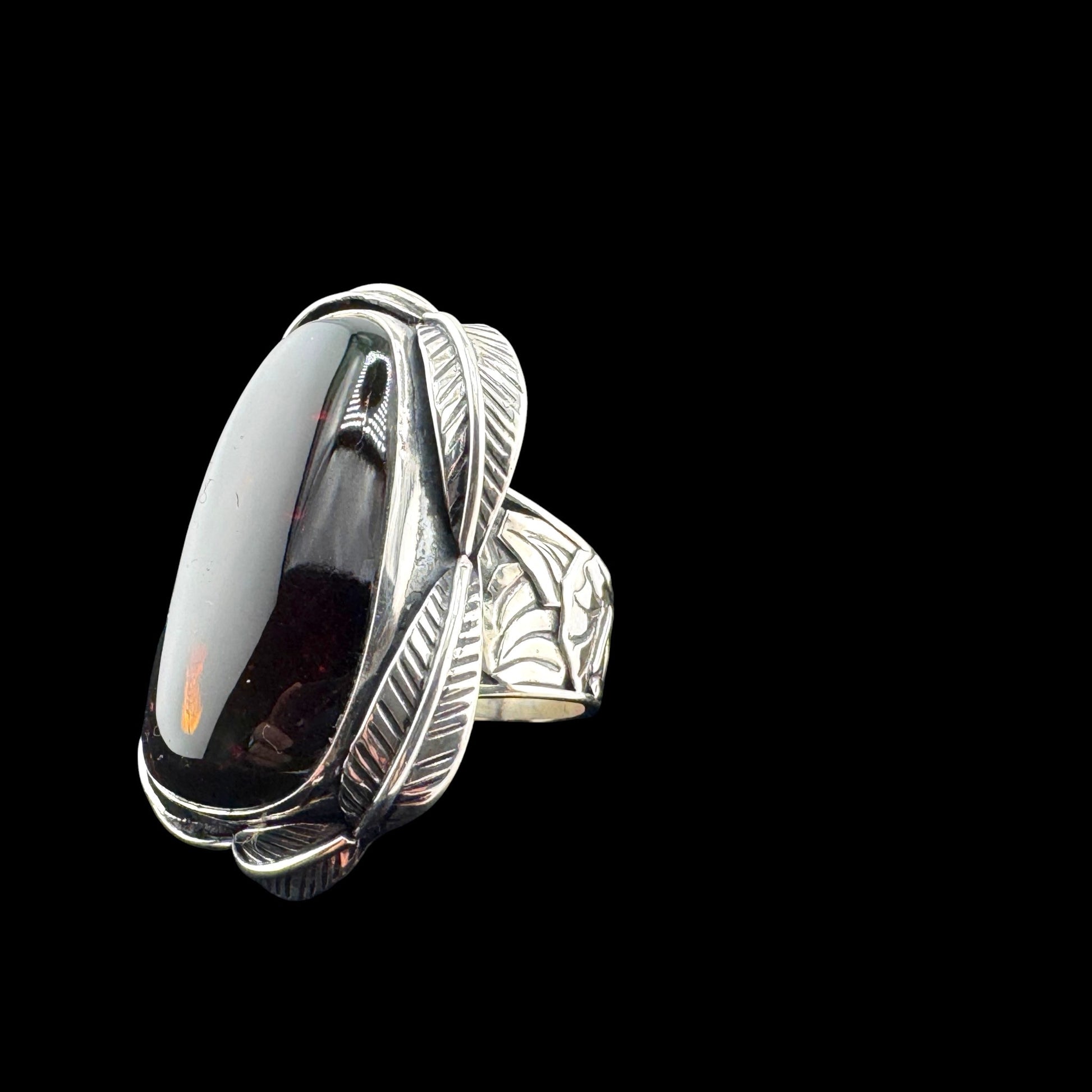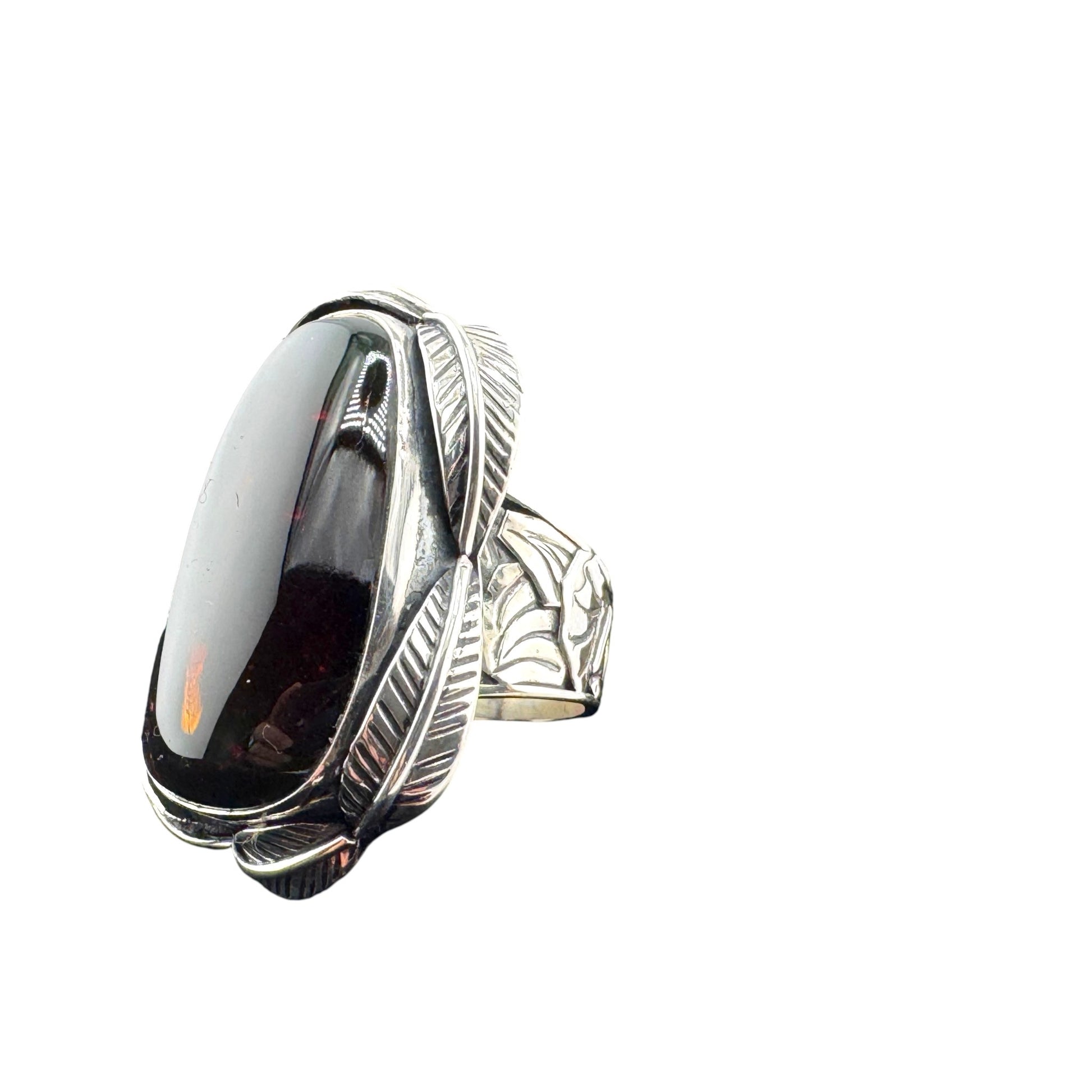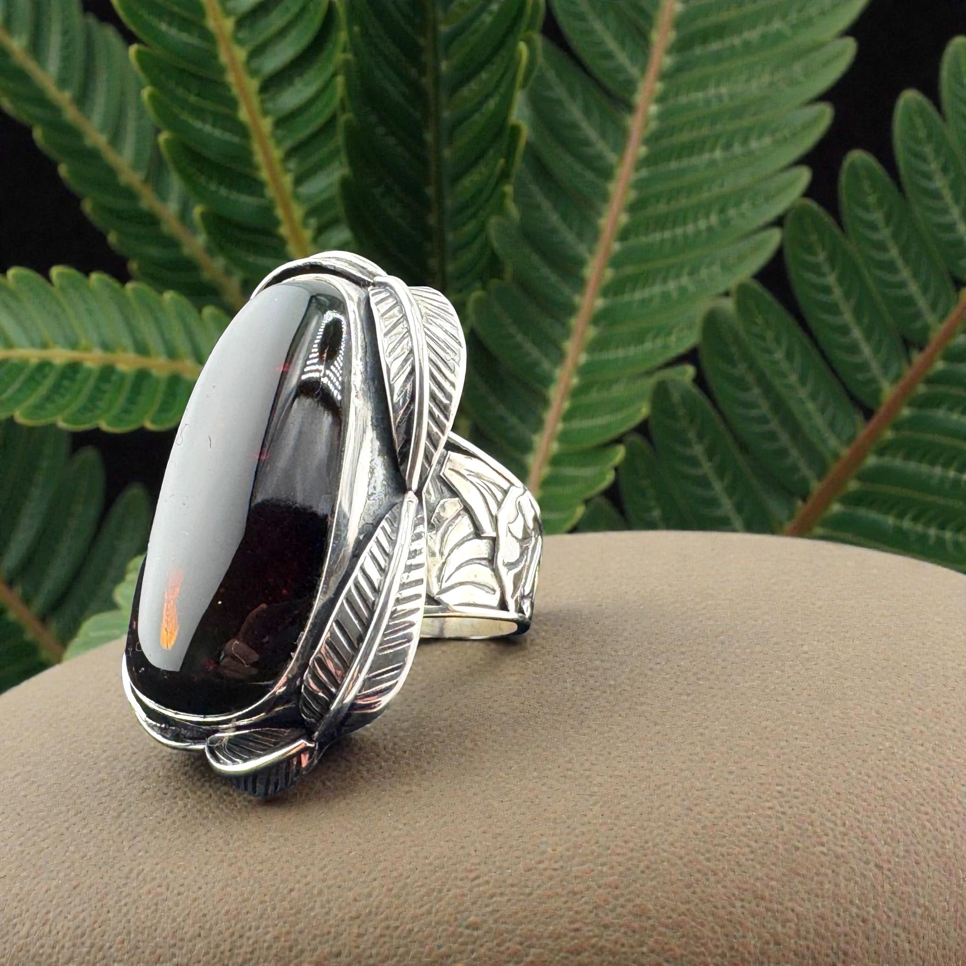 Size 7 Triangular Amber Ring with detailed 950 silver work with leaves, Ambar Triangulo, Artisan crafted sterling silver. ASC2-R065-070