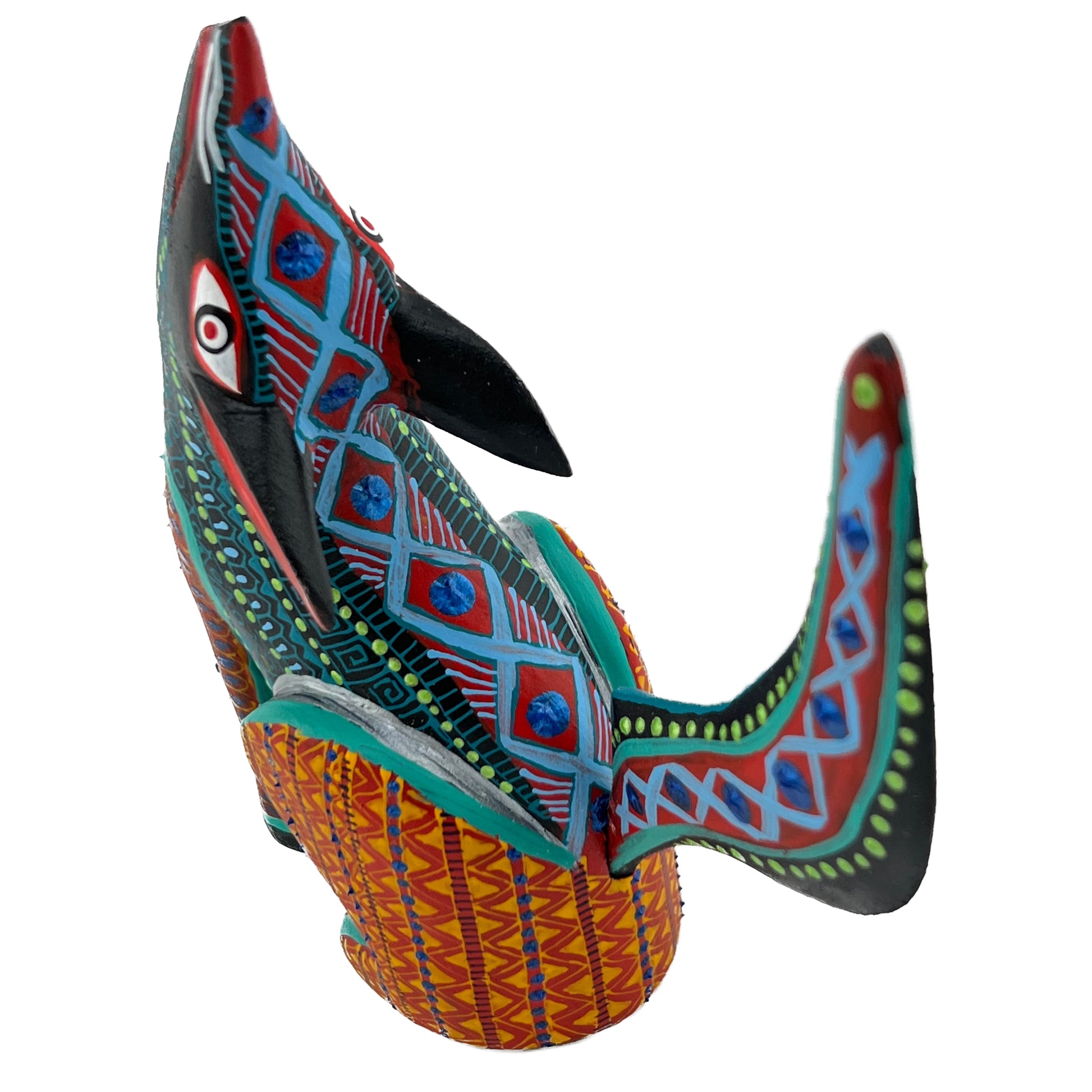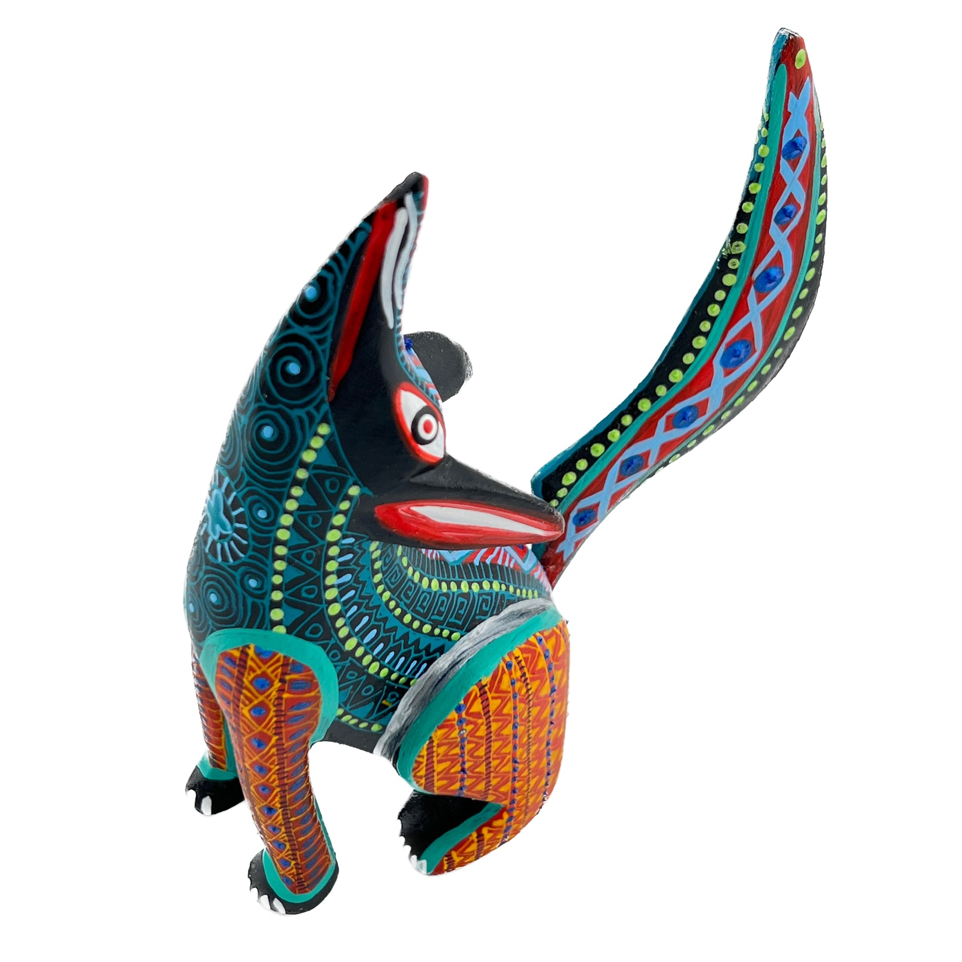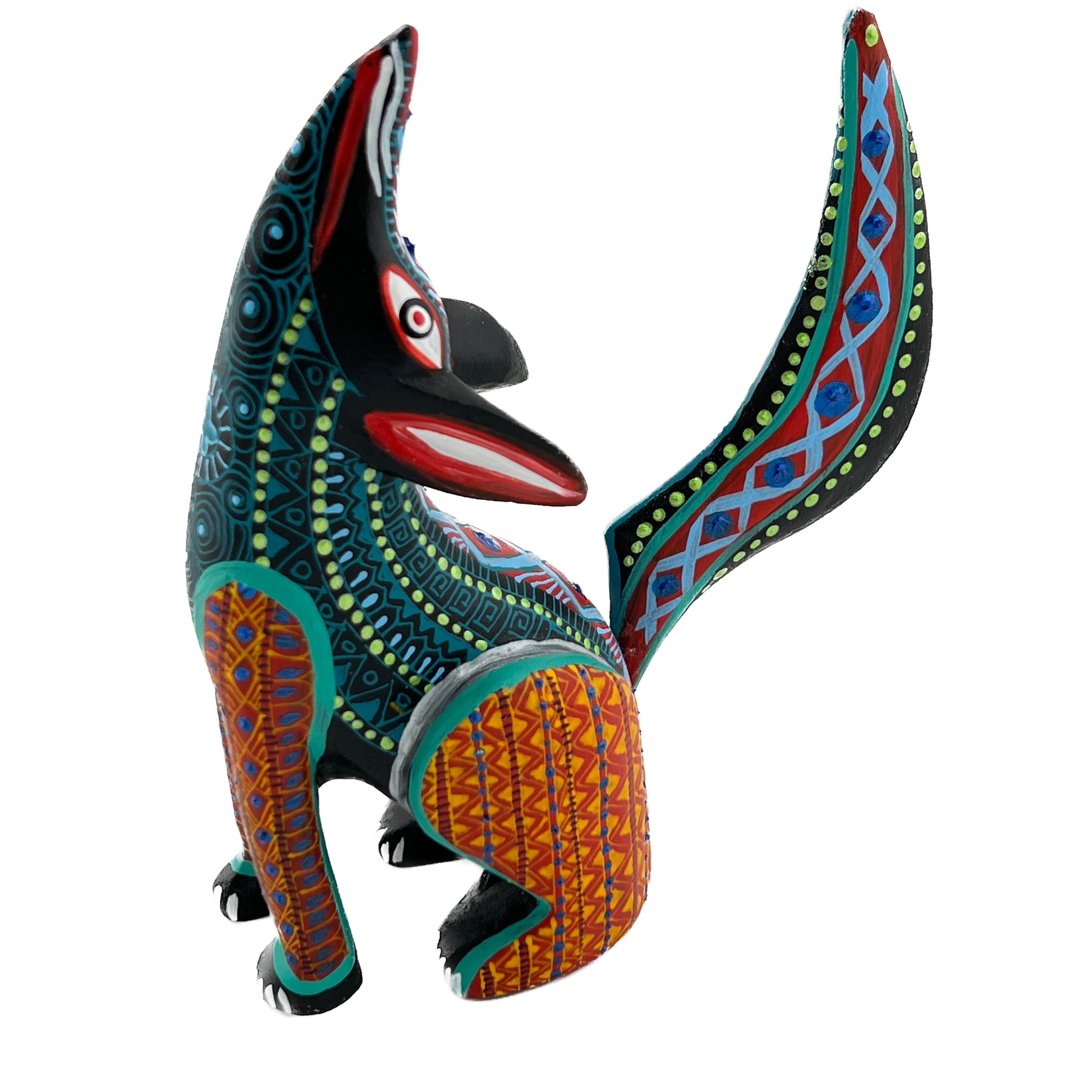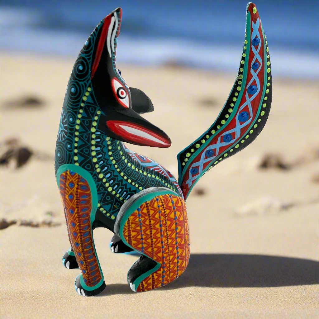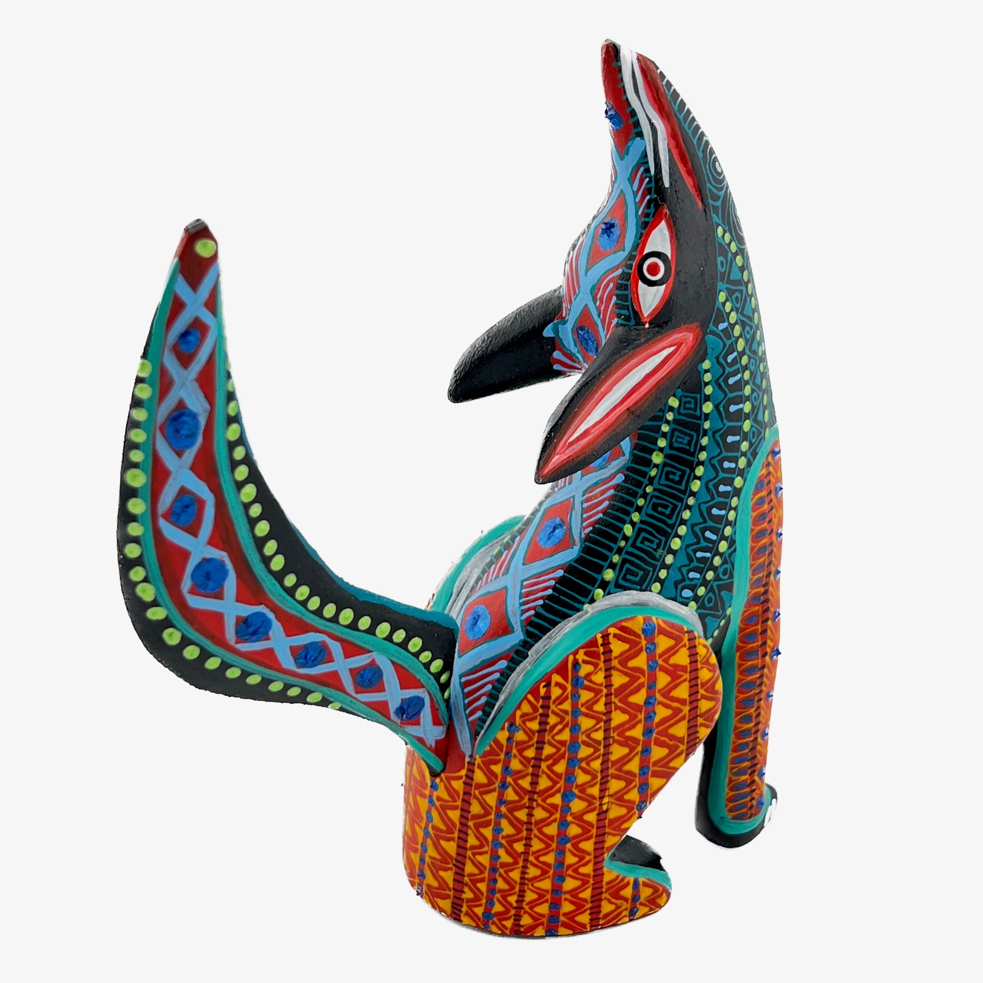 Inspired by the vibrant spirit of Mexican folk art, this Alebrije Wolf Lobo stands as a colorful guardian. Crafted of copal wood, with intricate painted patterns and bold colors, it brings a touch of mystique and energy to any space. Perfect for those seeking a unique piece that celebrates creativity and tradition, this wolf figurine invites imagination and storytelling into your home. Approx. approx. 6"H x x 5"W x 2"D, CSO0231.