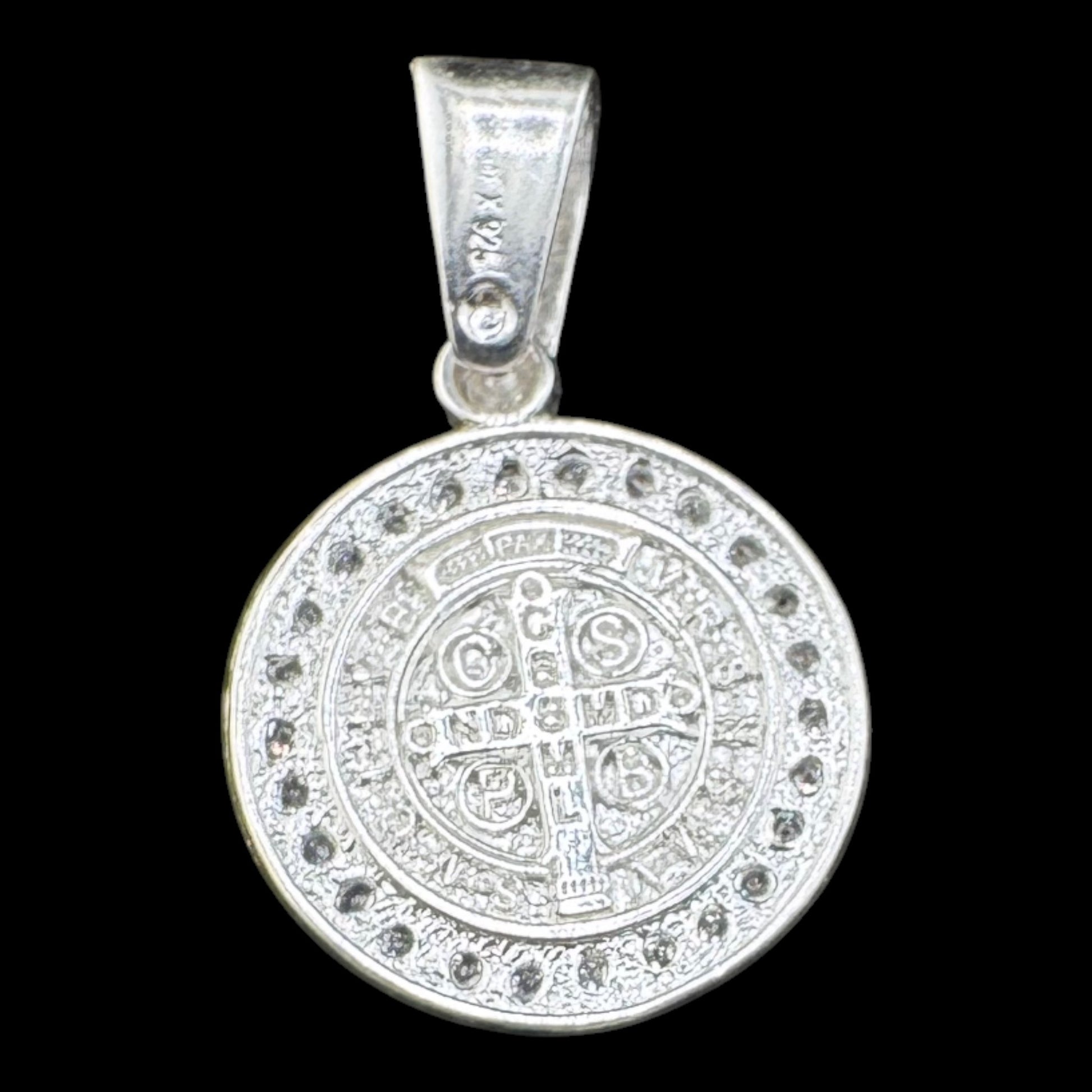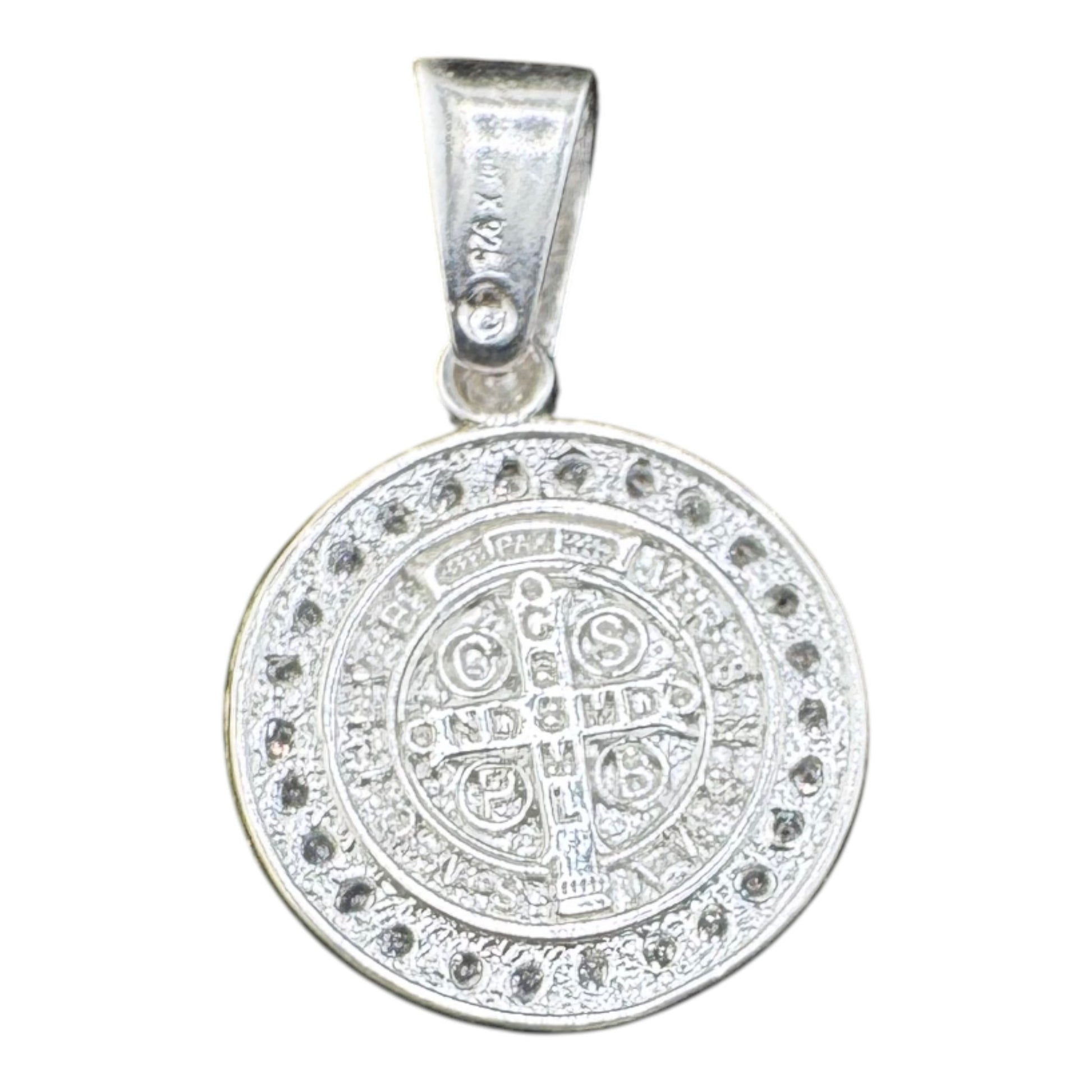 Handcrafted solid 925MX sterling silver 17mm Saint Benedict .925 Sterling Silver Pendant w Cubic Zirconia. St. Benedict has been associated with opening difficult paths, protection from evil, and protecting good health. CYG2-P005