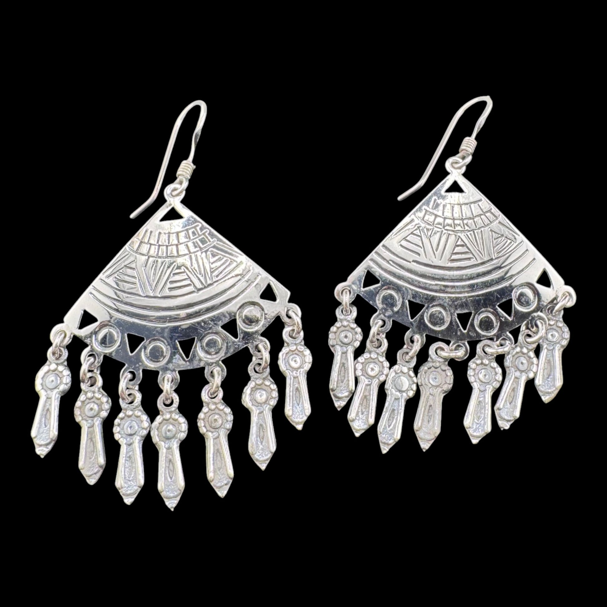 Artisan crafted solid 925MX sterling silver Albanico Lanzas fan with fringes 35mm x 35mm dangle earrings, EB2-E002