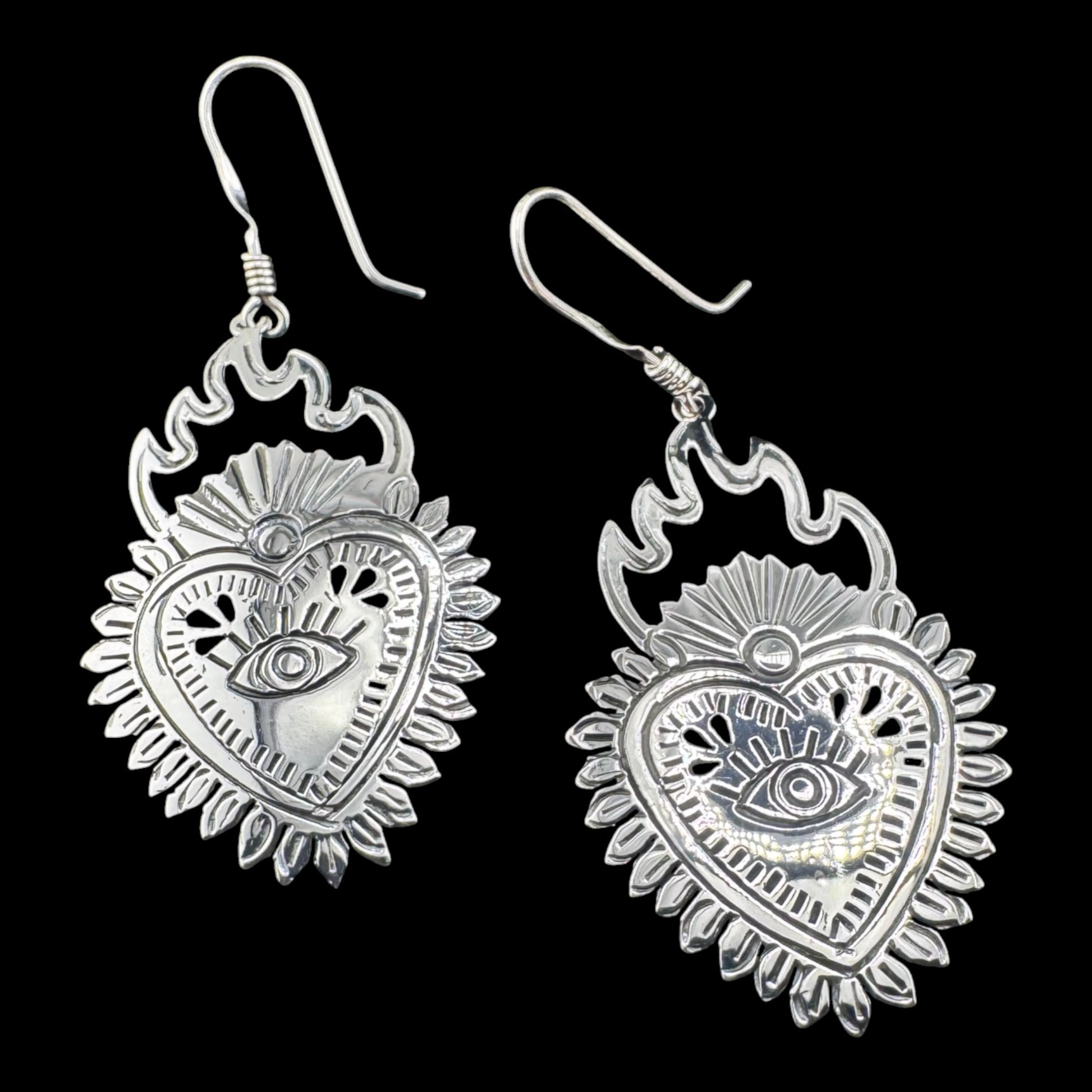 Artisan crafted solid 925MX sterling silver Corazon Cincelado, detailed heart 29mm x 30mm drop earrings, EB2-E003