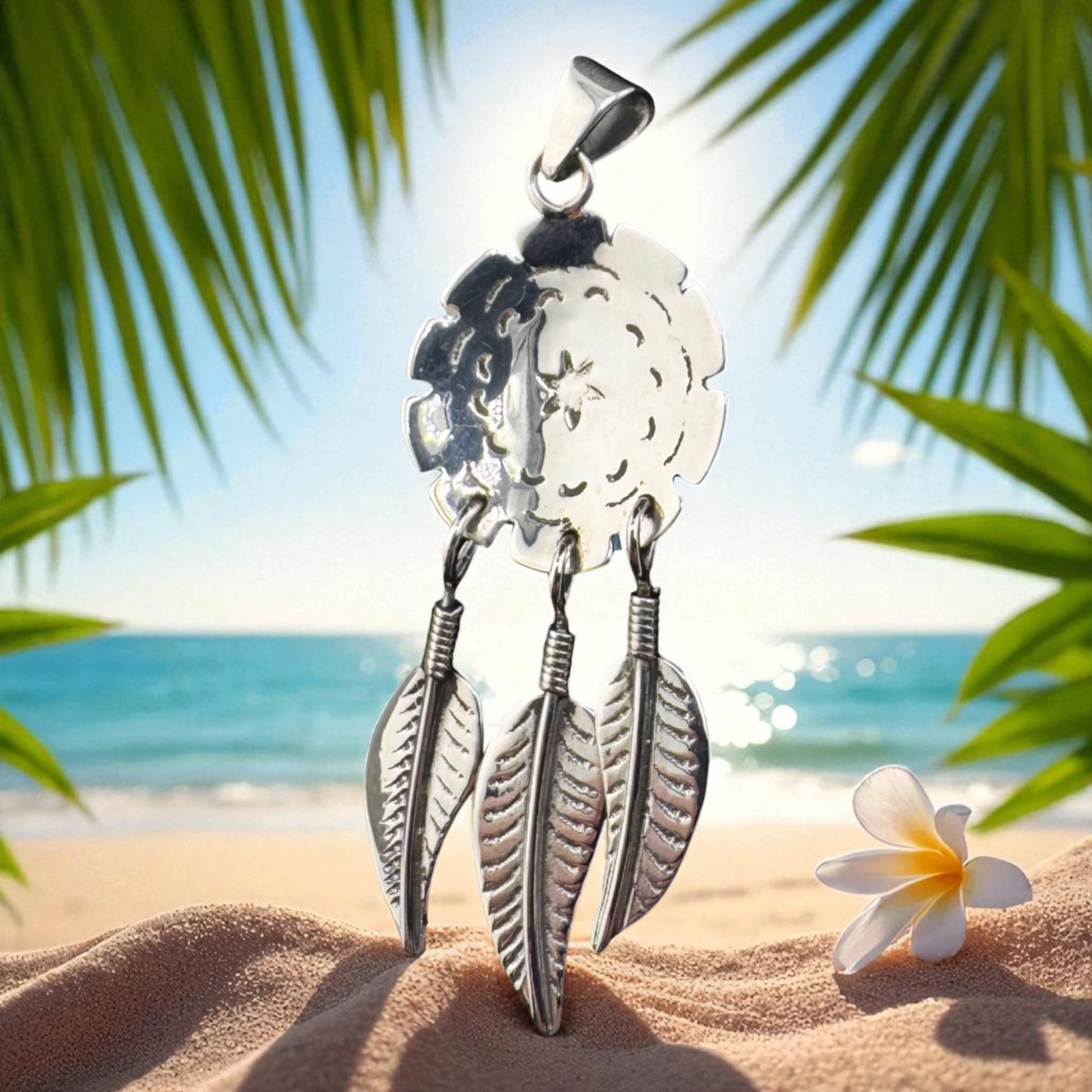 Artisan crafted solid 925MX sterling silver Atrapasuenos Plumas, dreamcatcher with feathers 24mm x 48mm Pendant, EB2-P003