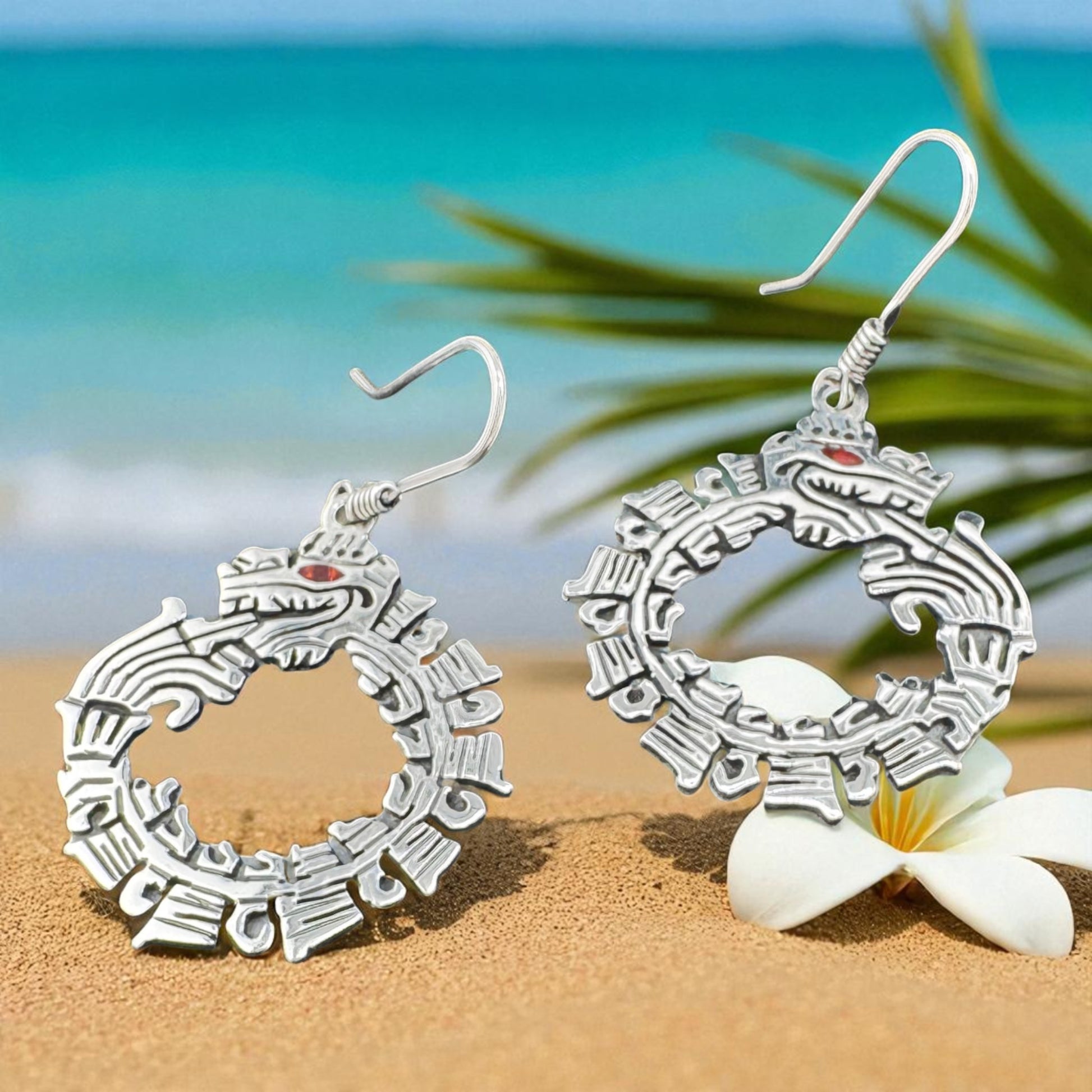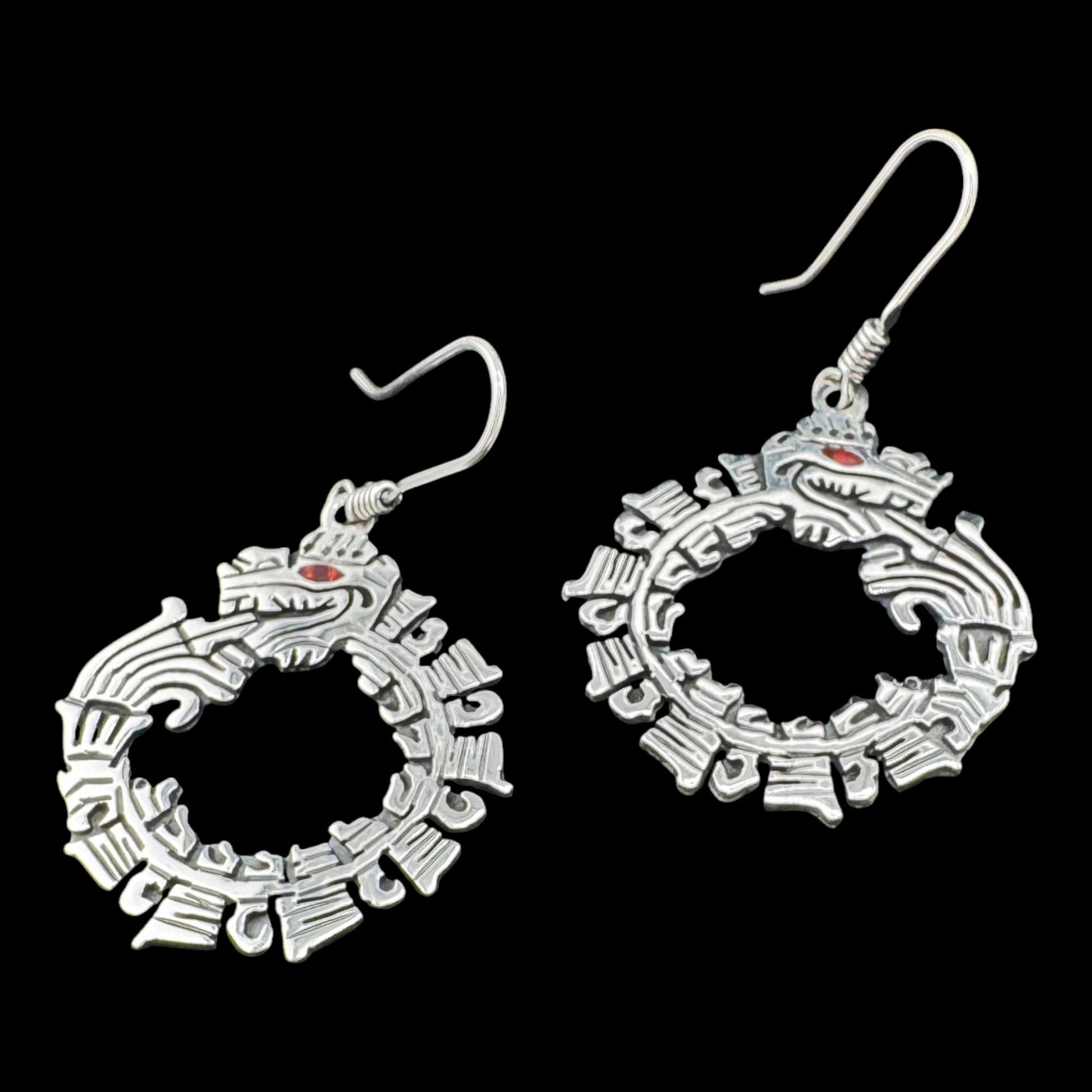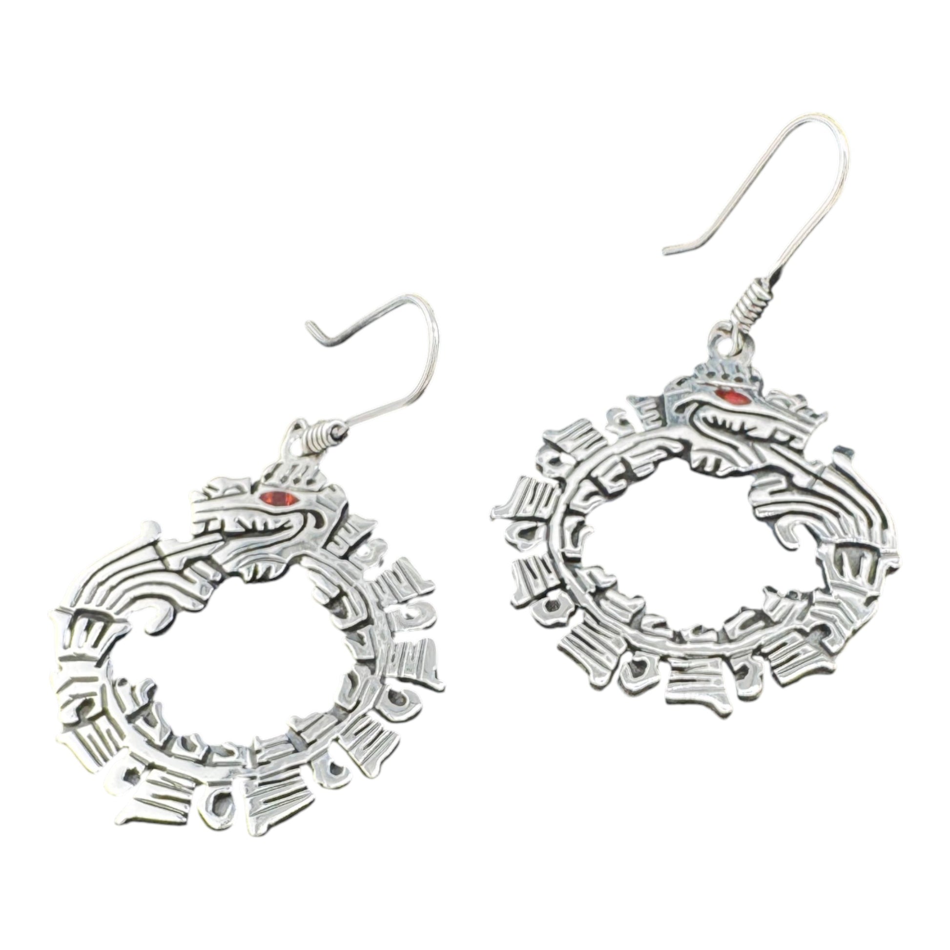 Embrace the ancient mystique of our exquisite Quetzalcoatl Calendar Drop Earrings. These captivating earrings feature a meticulously detailed depiction of the Aztec calendar, intricately intertwined with the powerful feathered serpent, Quetzalcoatl. A striking red gemstone eye adds a vibrant focal point, bringing this mythical design to life. Artisan crafted from solid .925 sterling silver, these earrings boast meticulous hand-finished details, making them a powerful and versatile accessory. Approx. 30mm x 33mm., Quetzalcoatl Calendar Drop Earrings, JTO-E001