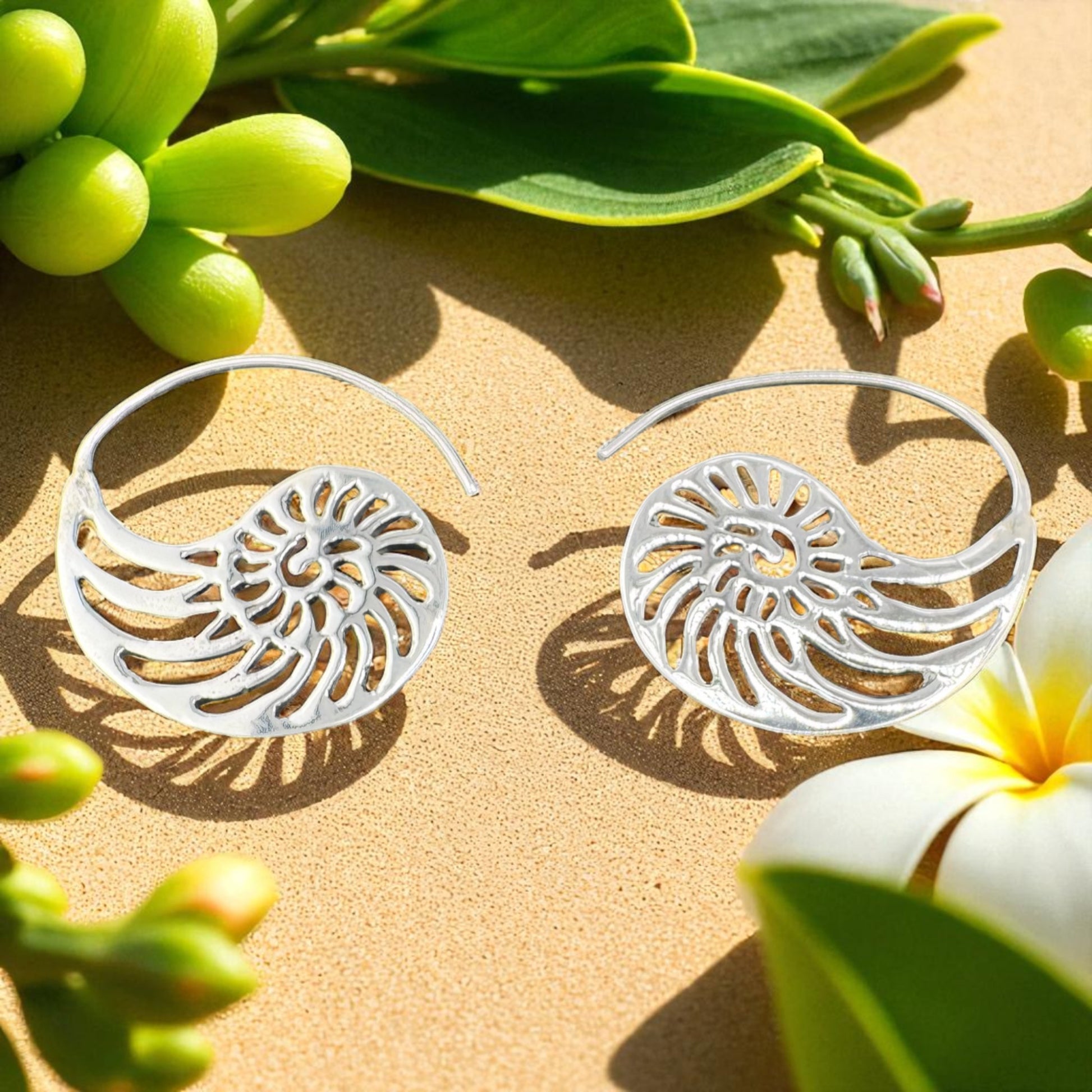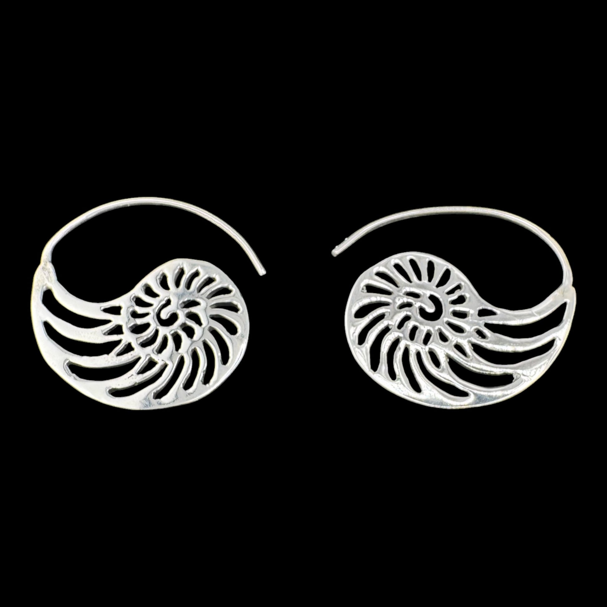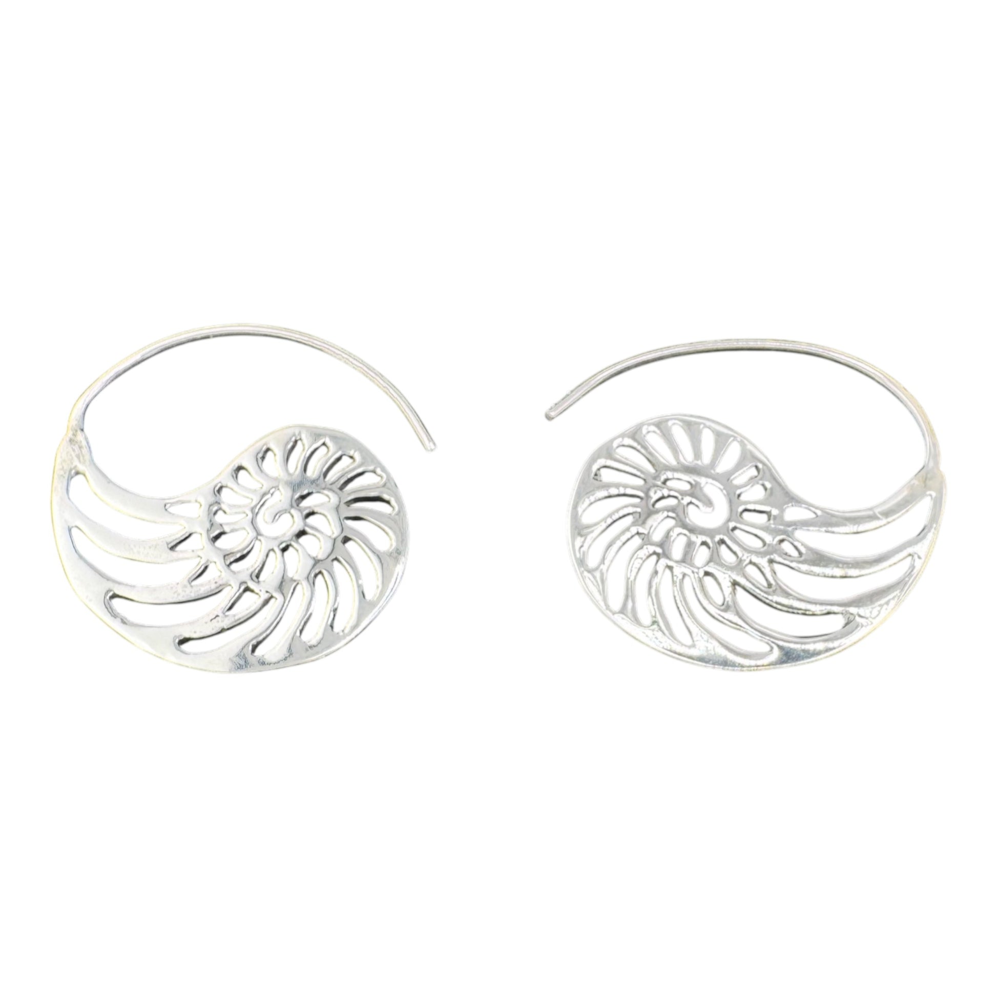 Discover organic elegance with these Nautilus Spiral Hook Earrings. The captivating, beautifully intricate nautilus shell inspired spiral design symbolizes growth and natural harmony. Artisan crafted from solid .925 sterling silver, the meticulously hand finished details make them a unique and versatile accessory. Approx. 24mm x 28mm., Nautilus Spiral Earrings 28mm, JTO-E003