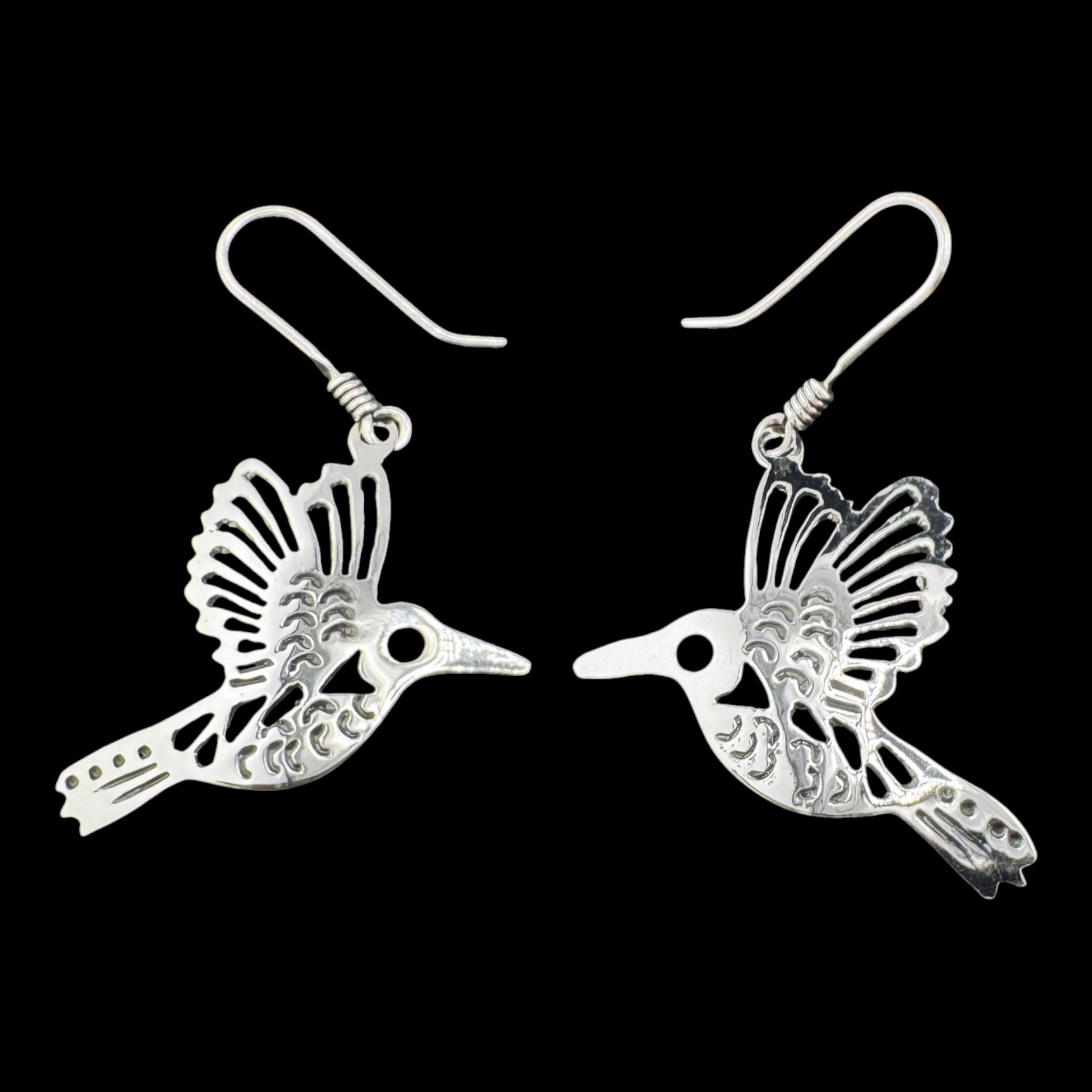 Embrace delicate charm with these Hummingbird Outline Drop Earrings. These captivating earrings feature a beautifully intricate hummingbird silhouette, symbolizing joy and agility. Artisan crafted from solid .925 sterling silver, these earrings boast meticulous hand-finished details, making them a charming and versatile accessory. Approx. 28mm x 35mm., Hummingbird Outline Drop Earrings, JTO-E011