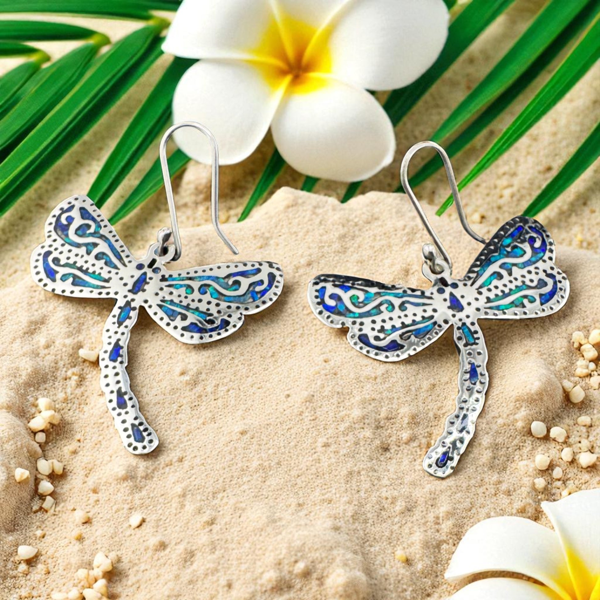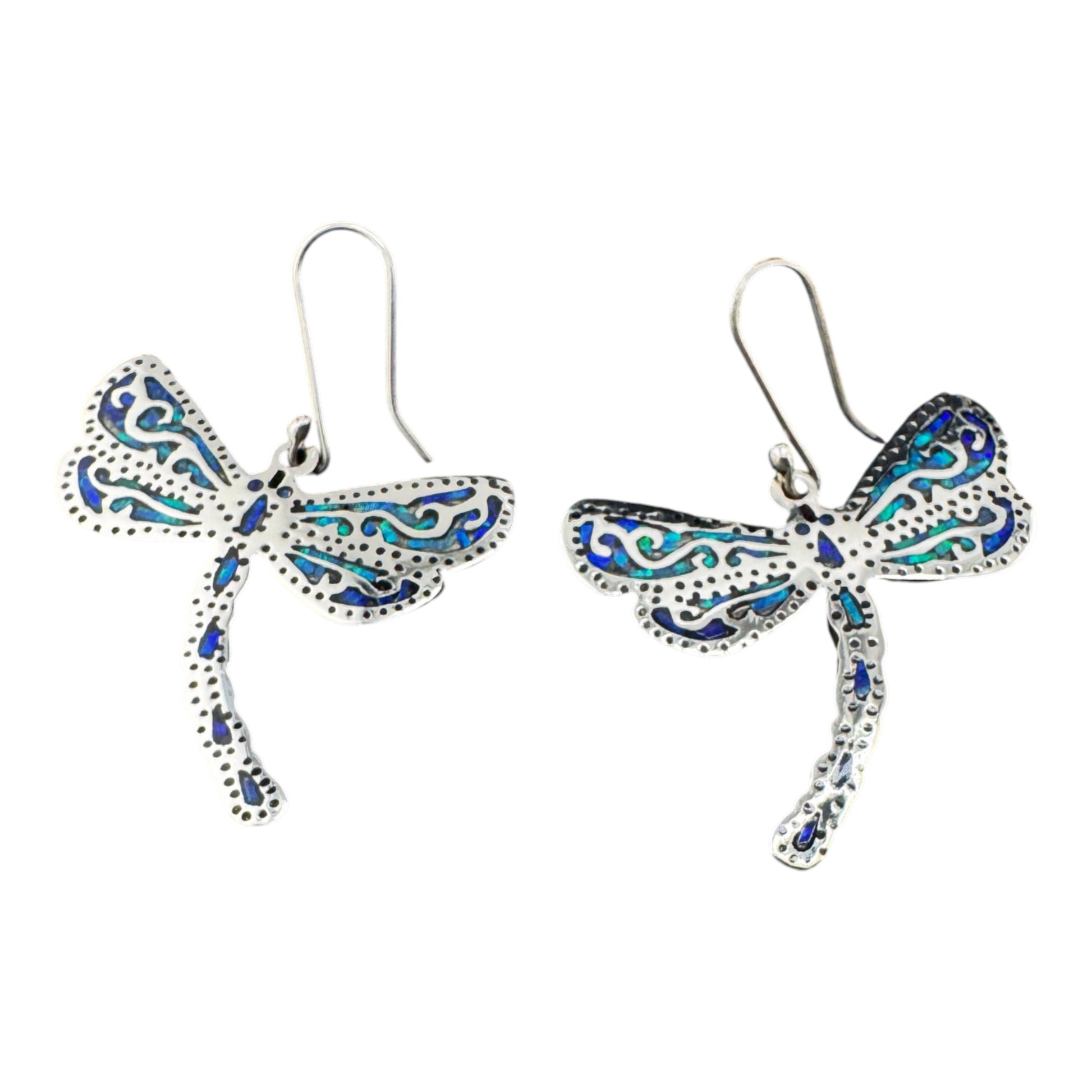 Embrace vibrant elegance with our exquisite Dragonfly Drop Earrings. These captivating earrings feature beautifully detailed dragonflies with striking blue and green accents, symbolizing transformation and joy. Artisan crafted from solid .925 sterling silver, these earrings boast meticulous hand-finished details, making them a charming and versatile accessory. Approx. 25mm x 20mm., Dragonfly Drop Earrings, JTO-E013