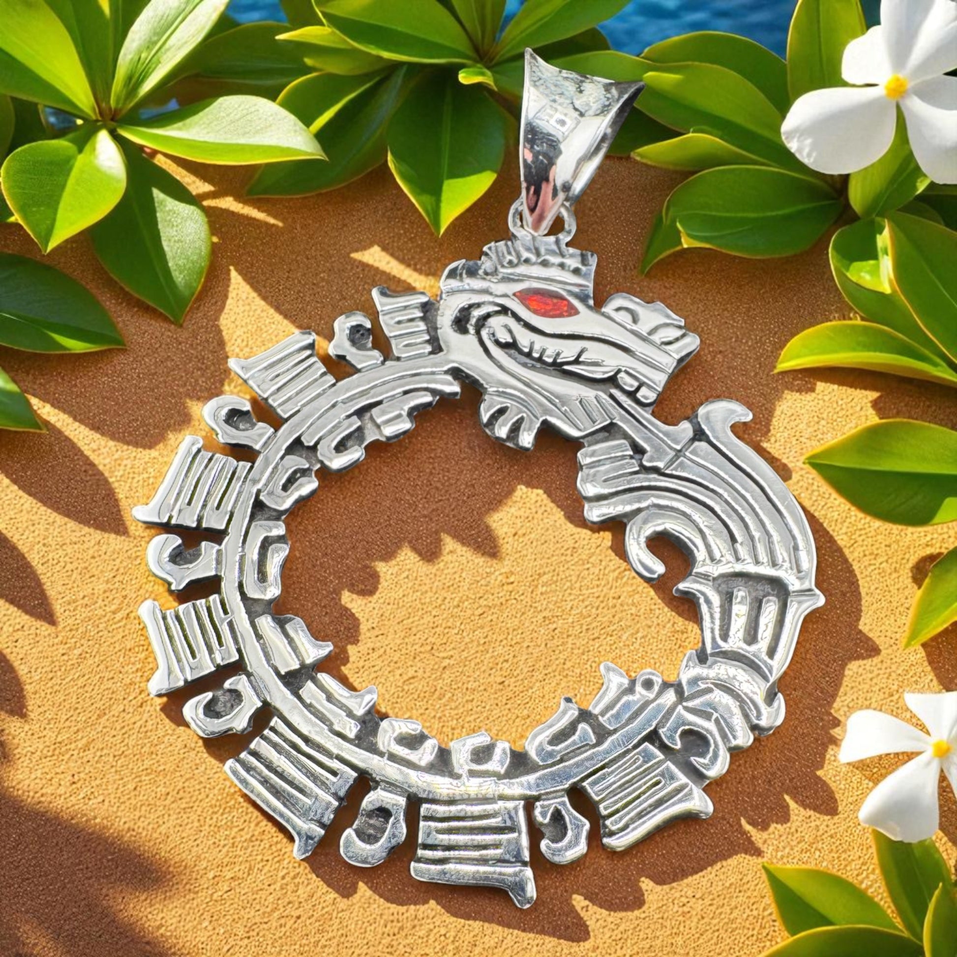 Discover ancient power with our exquisite .925 Sterling Silver Quetzalcoatl Calendar Pendant. This captivating piece features the intricate Aztec calendar, beautifully integrated with the mighty feathered serpent, Quetzalcoatl. A striking red gemstone eye adds a vibrant focal point, rich in cultural and symbolic meaning. Handcrafted from solid .925 sterling silver, this pendant boasts meticulous details, making it a powerful and versatile accessory. Approx: 41mm x 51mm., Quetzalcoatl Calendar Pendant, JTO-P001