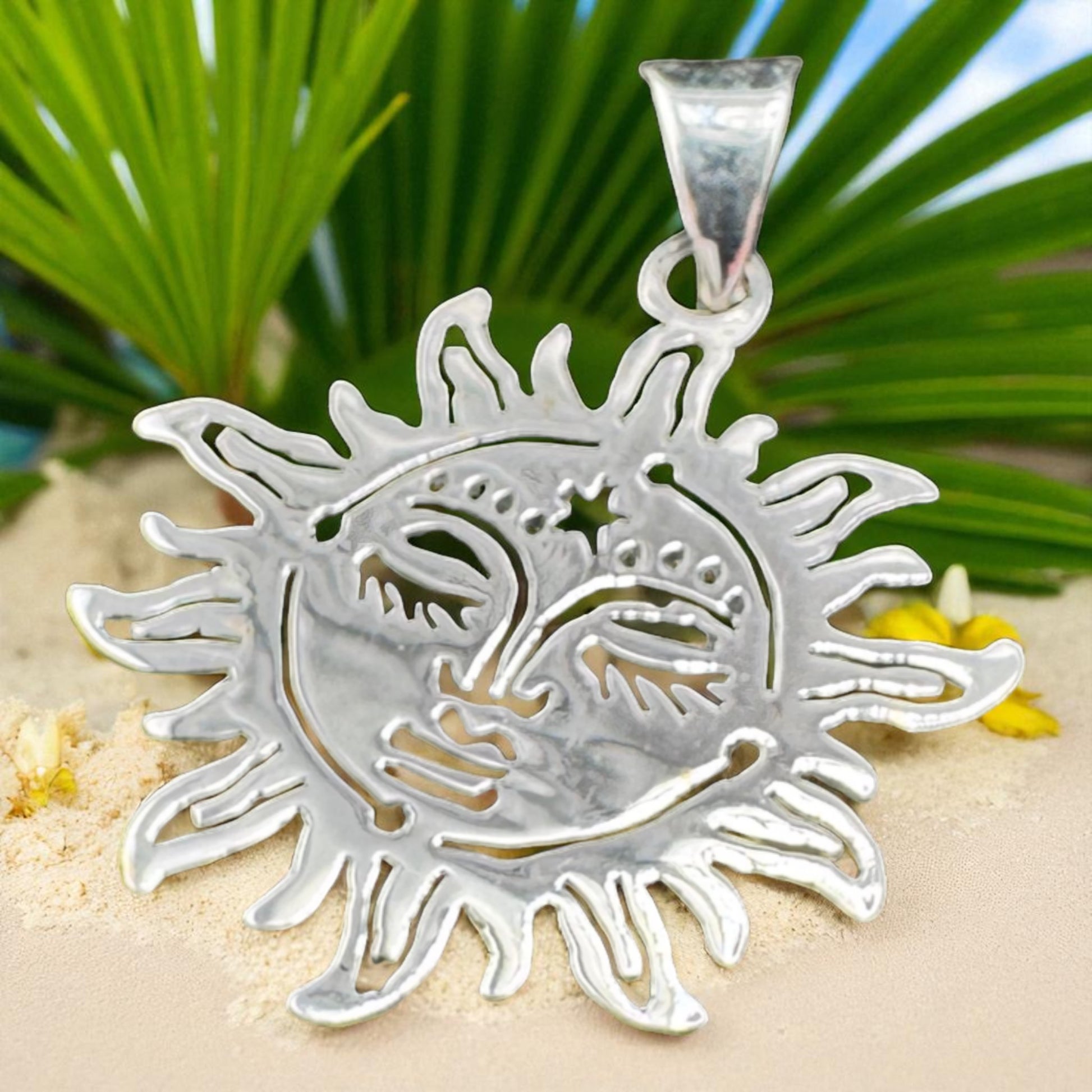 This Sun Face Pendant radiates warmth and positivity. This captivating piece features a smiling sun design, symbolizing life, energy, and happiness. Crafted from solid .925 sterling silver, this pendant displays meticulous hand-finished details, making it a bright and versatile accessory. Approx. 30mm diameter., Sun Face Pendant, JTO-P003