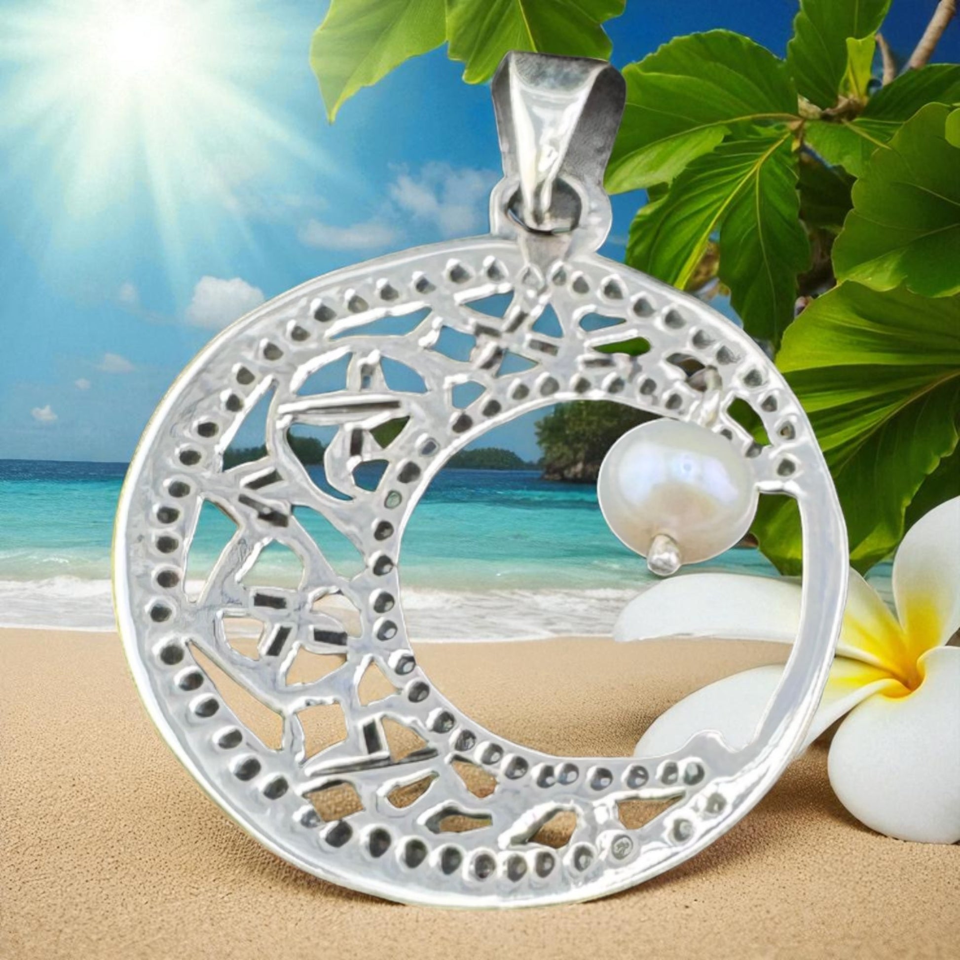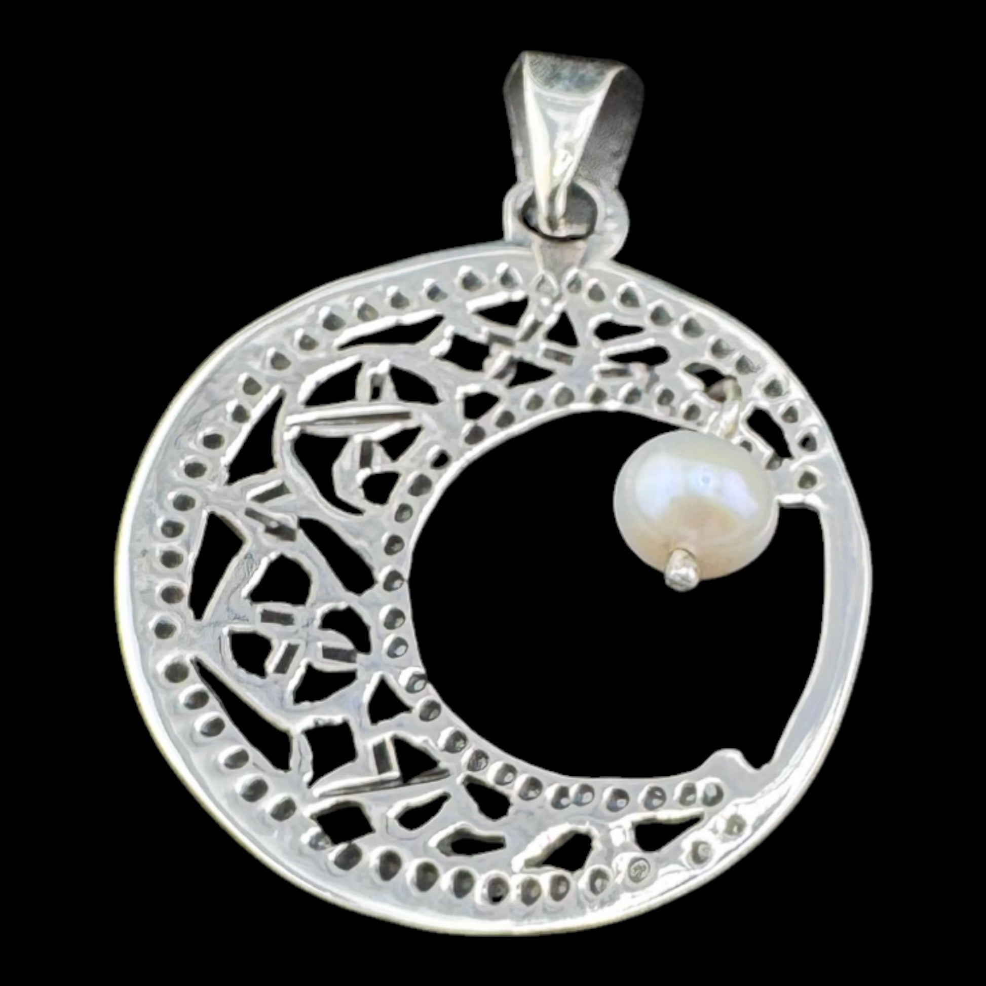 Capture lunar magic with this exquisite Crescent Moon with Pearl Pendant. This captivating piece features an intricate filigree crescent moon, gracefully adorned with a luminous freshwater pearl. Artisan crafted from solid .925 sterling silver, this pendant's meticulous hand finished details make it an elegant and versatile accessory. Symbolizing intuition, femininity, and cycles, this pendant ads a touch of classic elegance. Approx. 27mm diameter., Crescent Moon with Pearl Pendant, JTO-P004