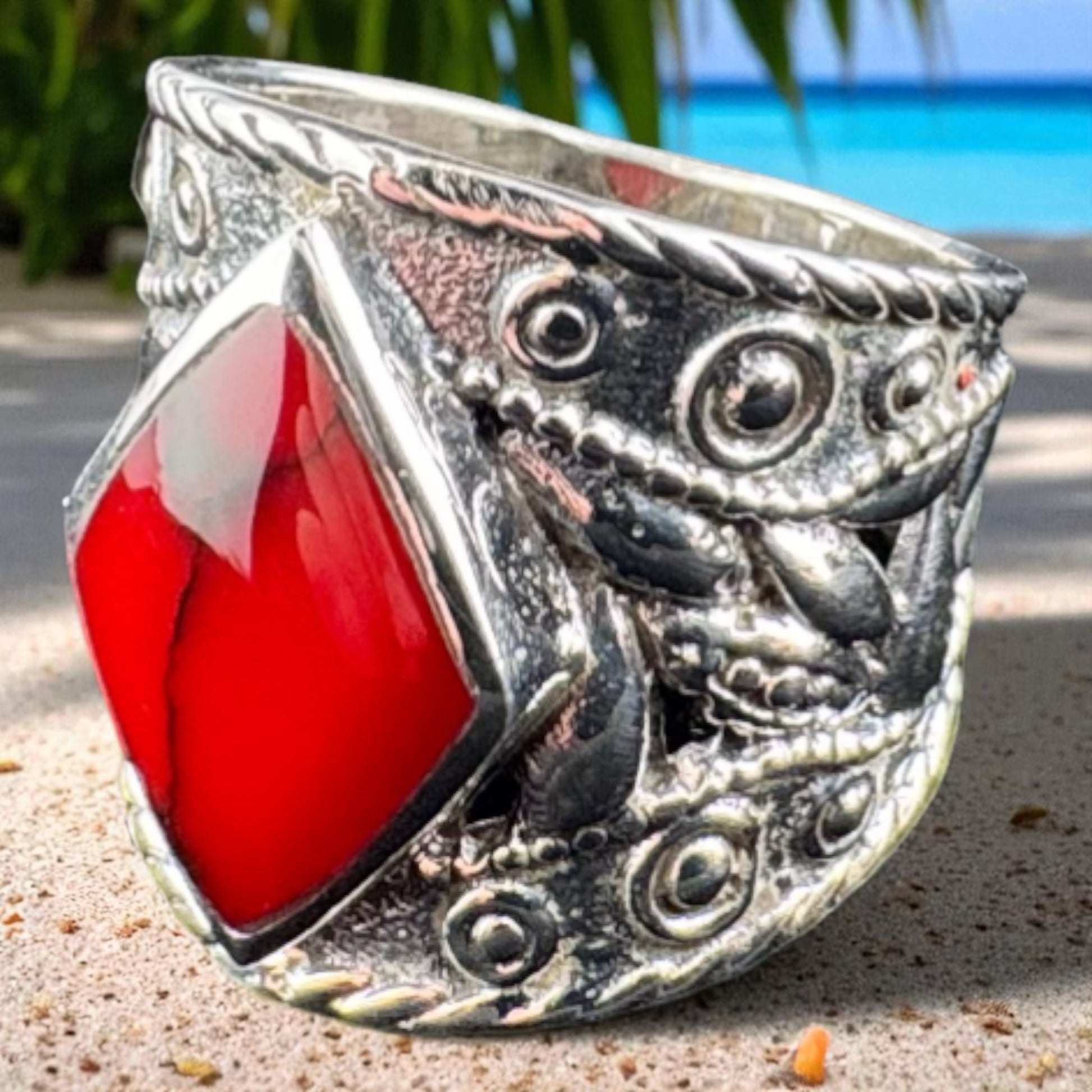 The diamond shaped red stone framed on this carved Patterned Band w/Red Stone Ring makes a bold statement., Patterned Band w/Red Stone Ring, Artisan crafted solid .925 sterling silver. MEM2-R009