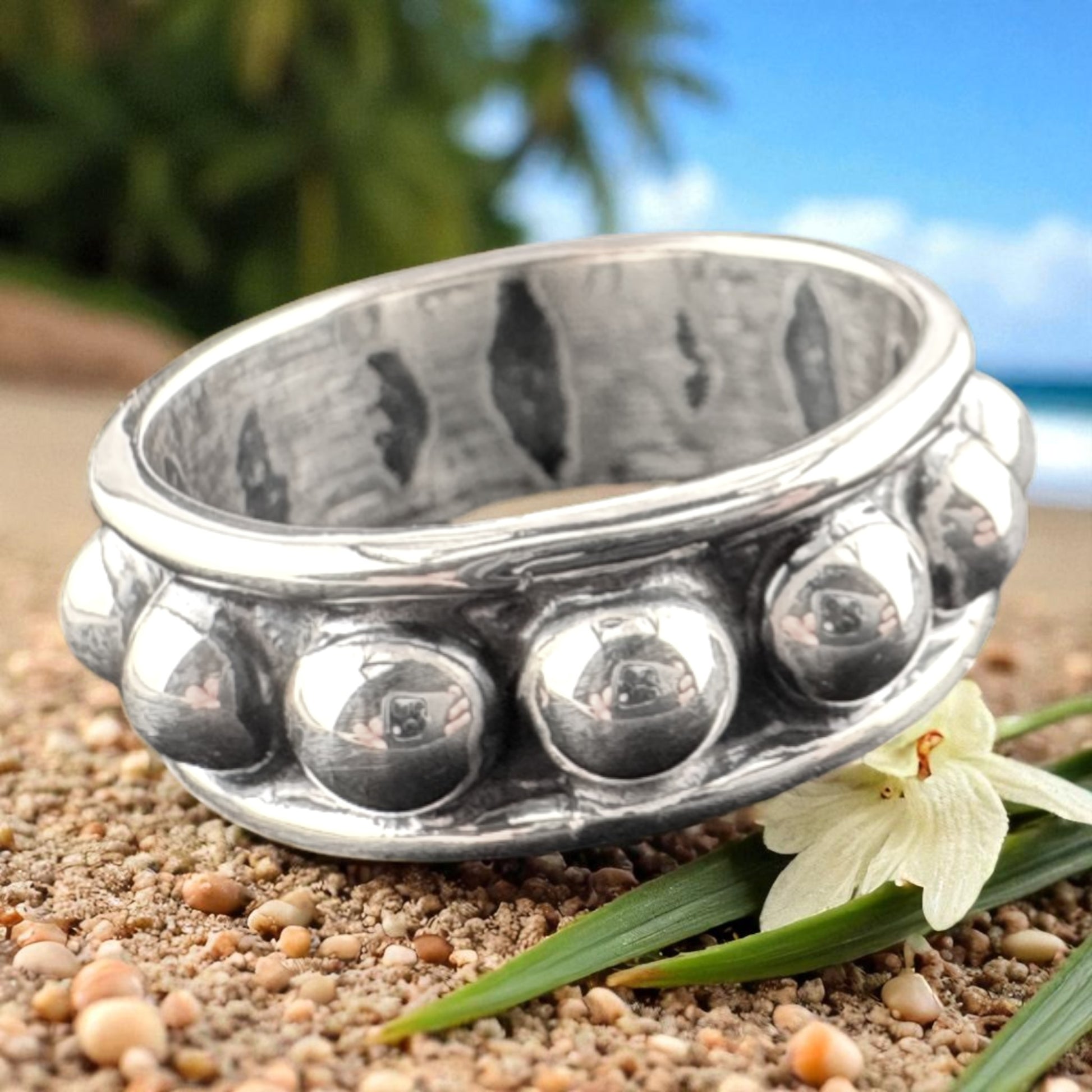A band ringed with raised half spheres, the Spheres Ring, a classic design. Approx. 8.5mm wide., Spheres Ring 8.5mm, Artisan crafted solid .925 sterling silver. MEM2-R017