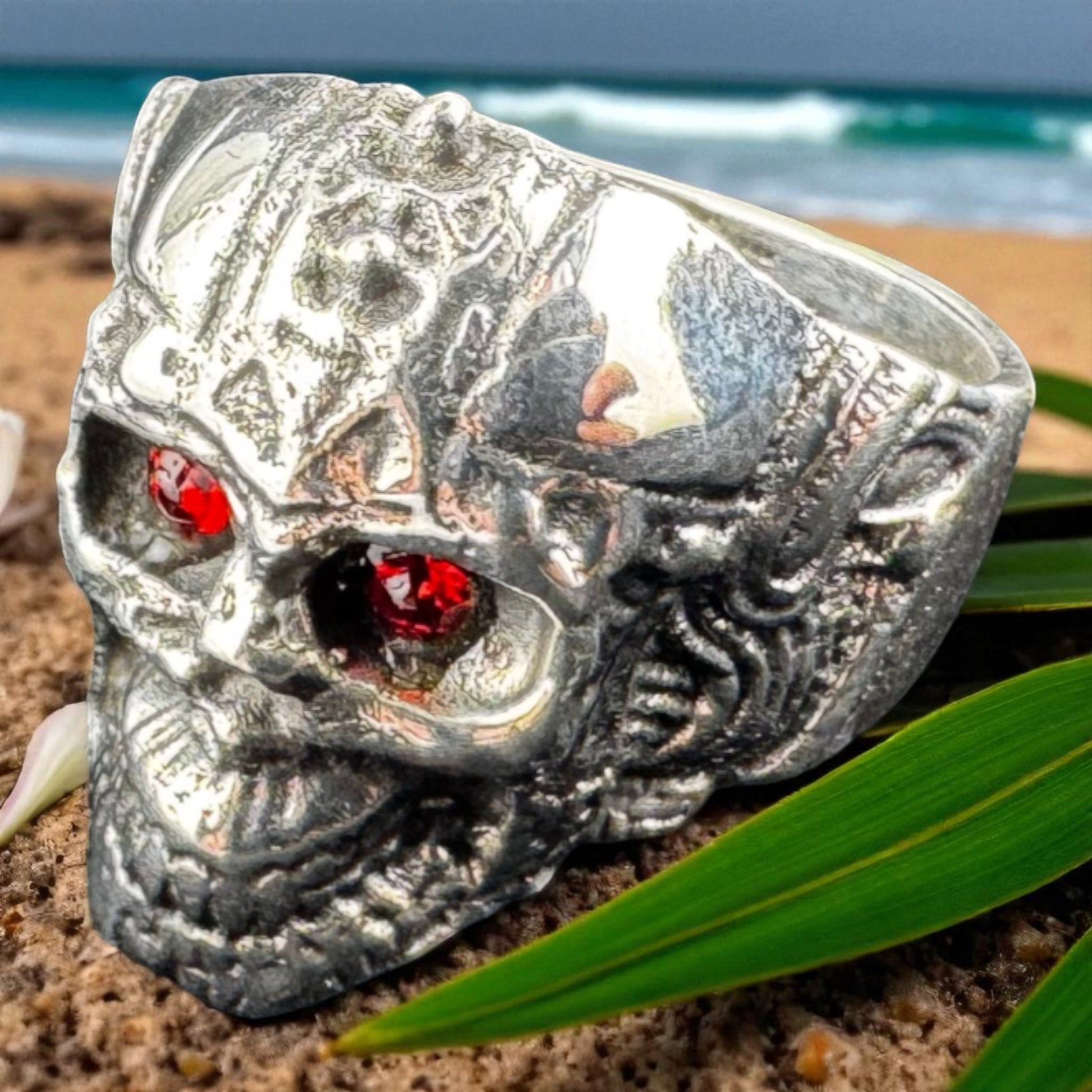 Sculpted in detail, our Skull w/Red Stone Eyes Ring, uniquely crafted., Skull w/Red Stone Eyes Ring, Artisan crafted solid .925 sterling silver. MEM2-R018
