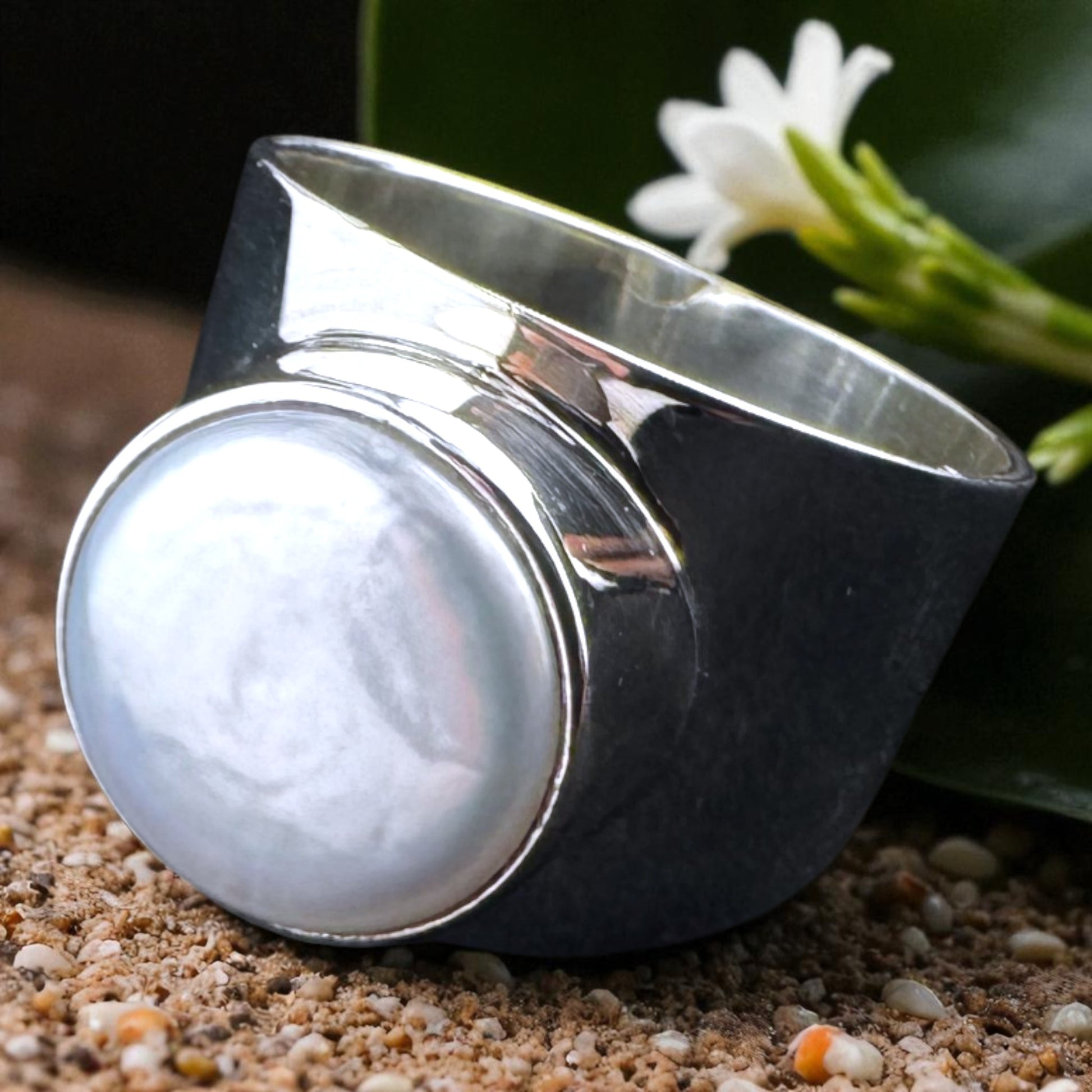 Wide band ring with a beautiful button freshwater pearl: Button Pearl Ring, Button Pearl Ring, Artisan crafted solid .925 sterling silver. MEM2-R025
