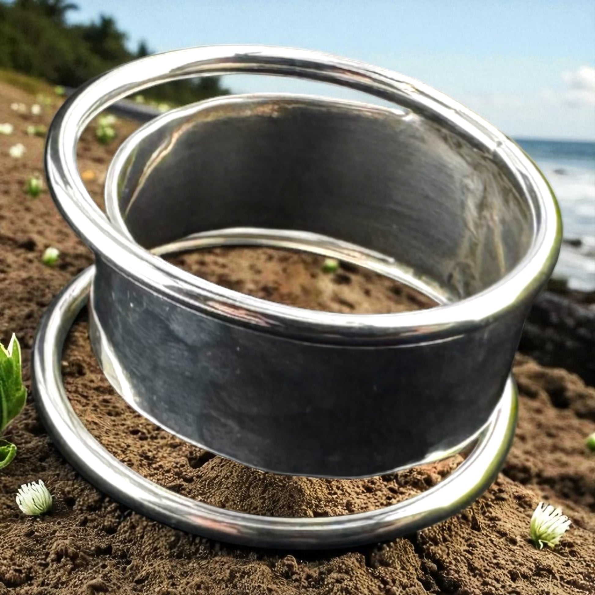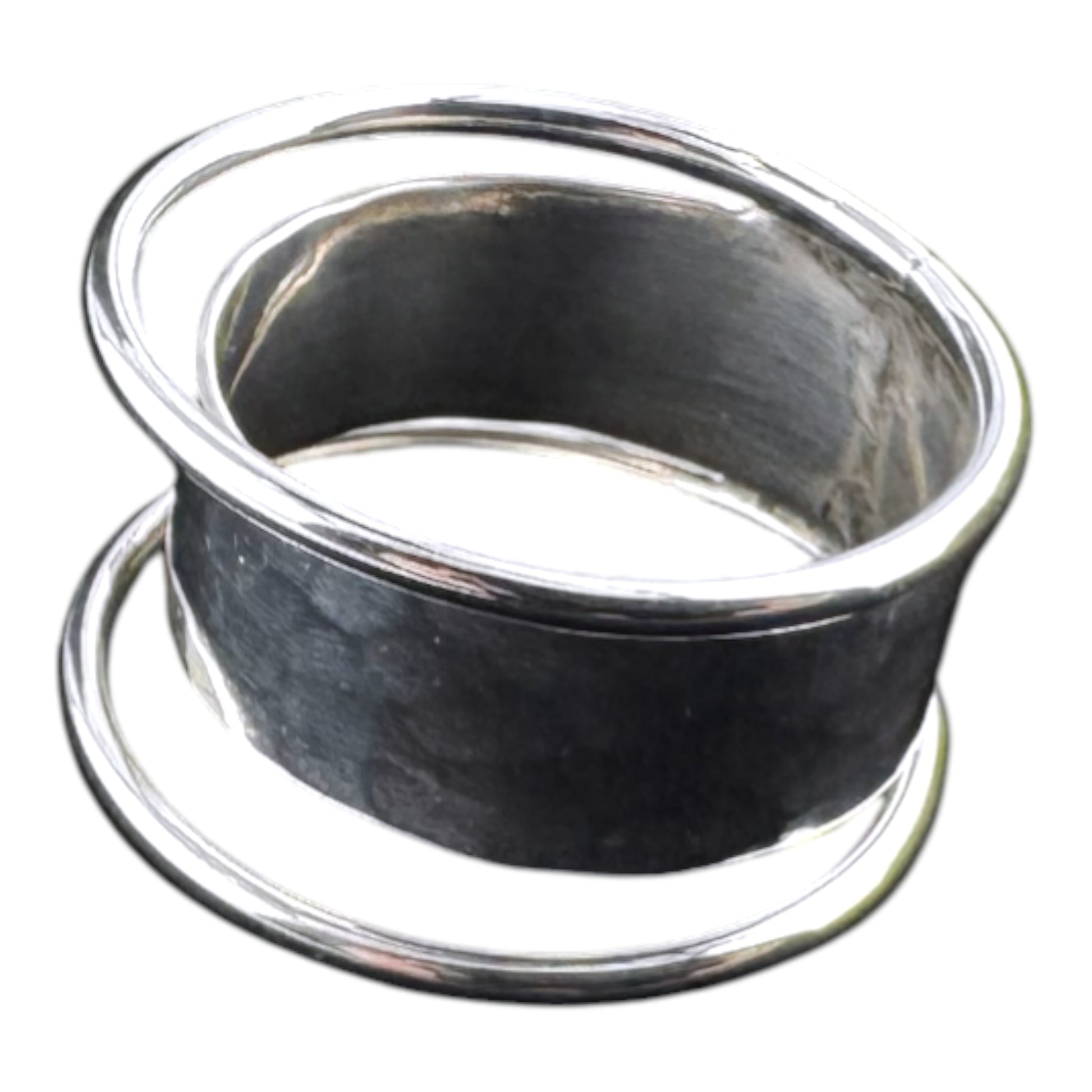 Unusual handcrafted Wide Multi Band Ring has a central hammerd band with 2 offset smaller bands. Approx. 12mm wide., Wide Multi Band Ring 12mm, Artisan crafted solid .925 sterling silver. MEM2-R030