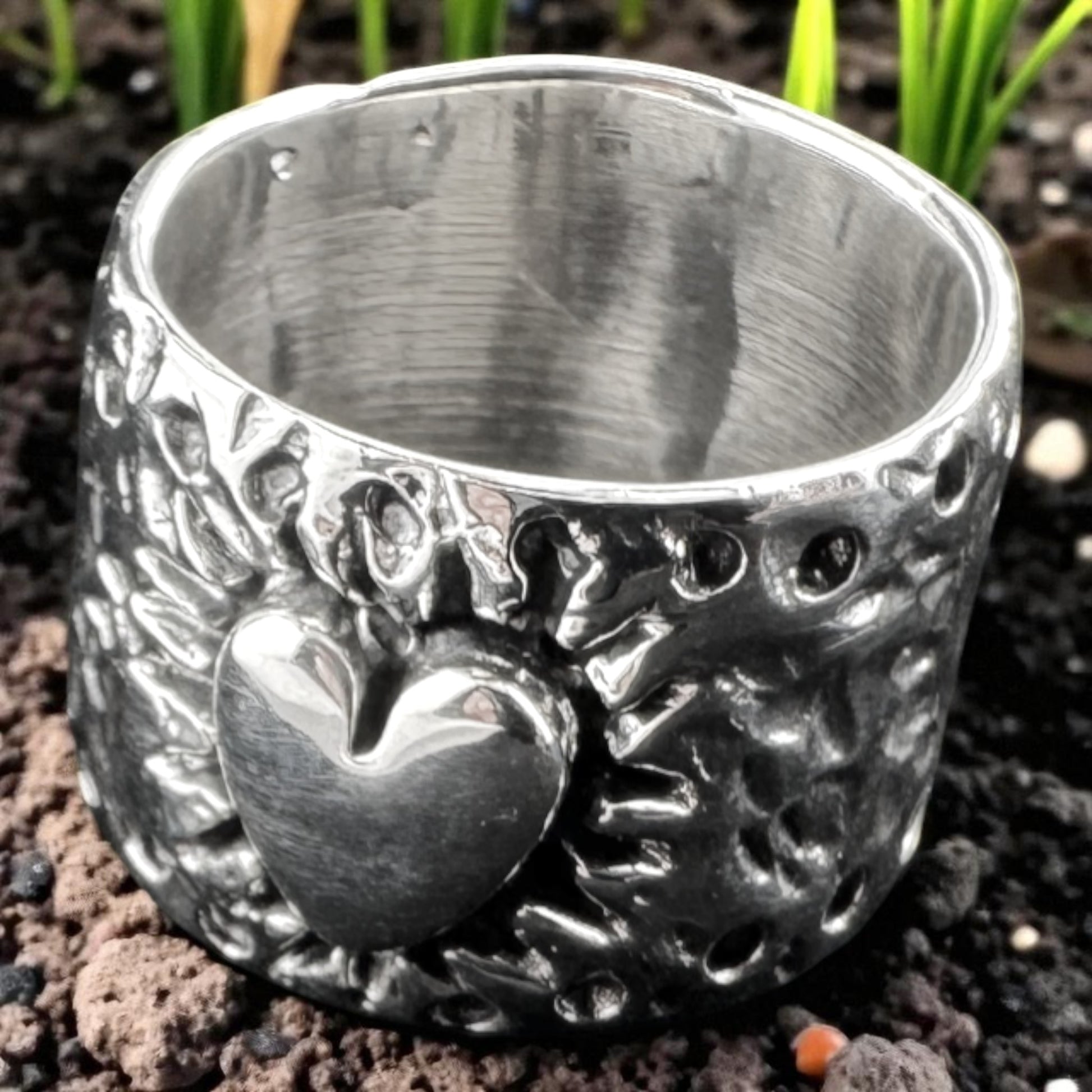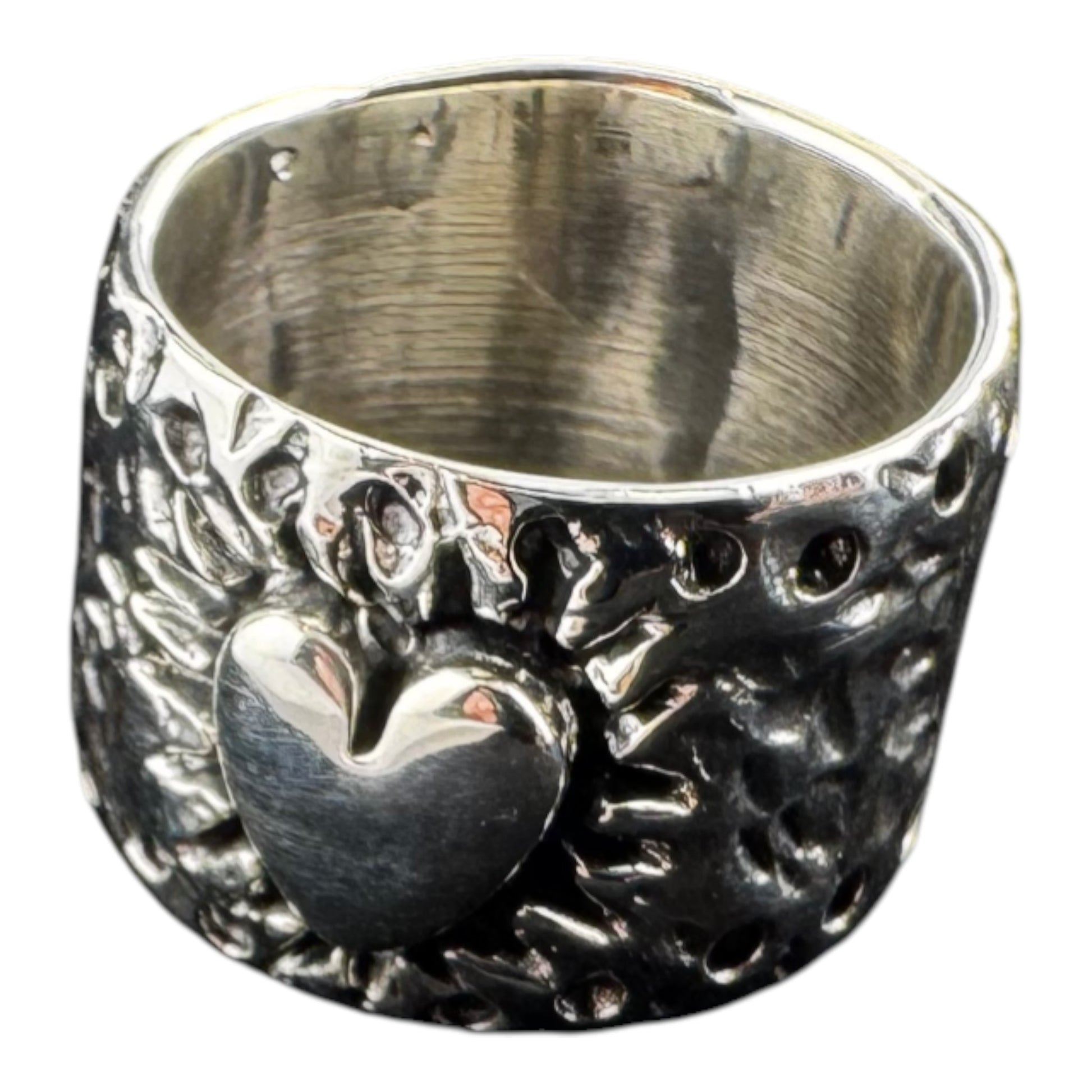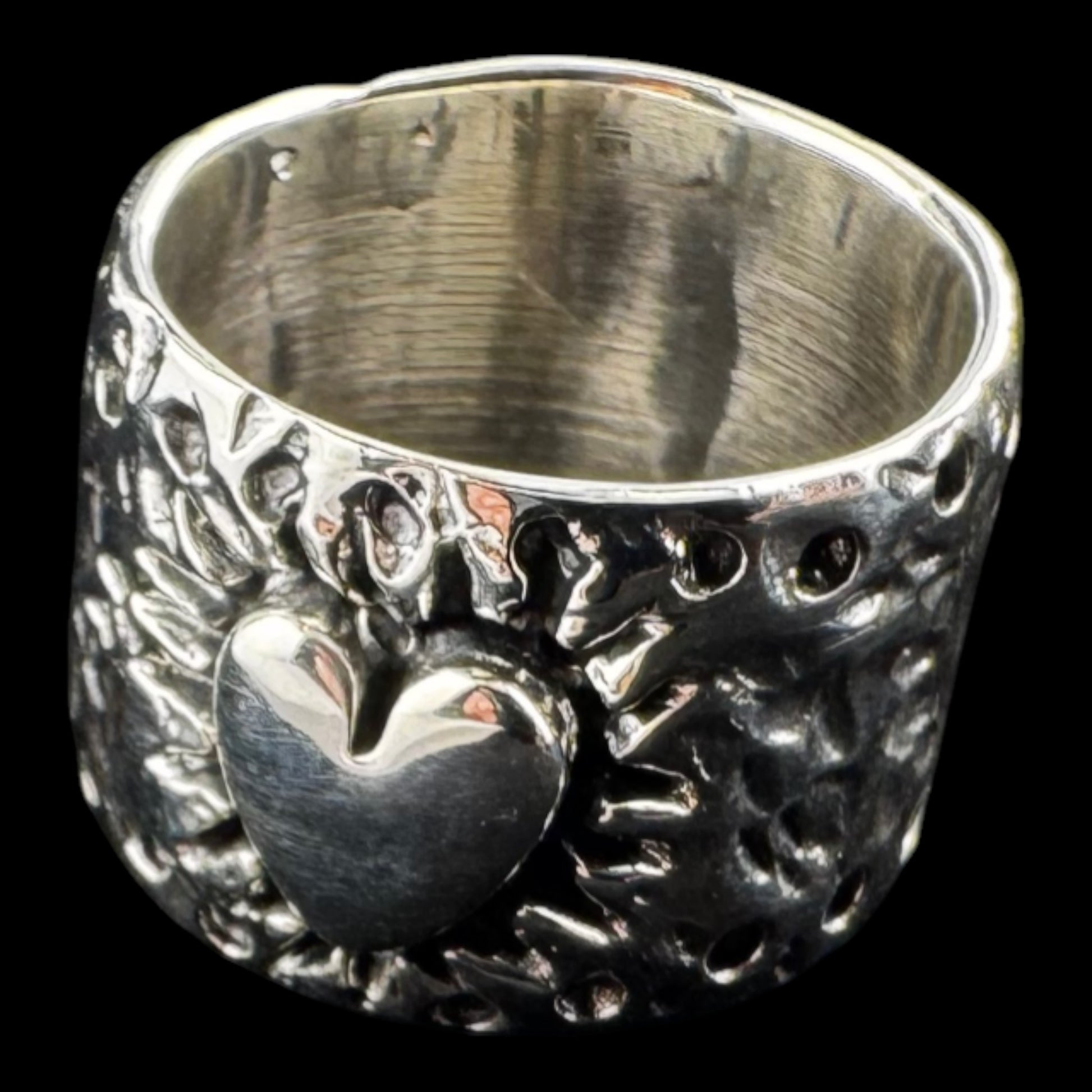 A wide hammered ring with carving of the Sacred Heart: Sacred Heart Band Ring, approx. 14mm wide., Sacred Heart Band Ring 14mm , Artisan crafted solid .925 sterling silver. MEM2-R031