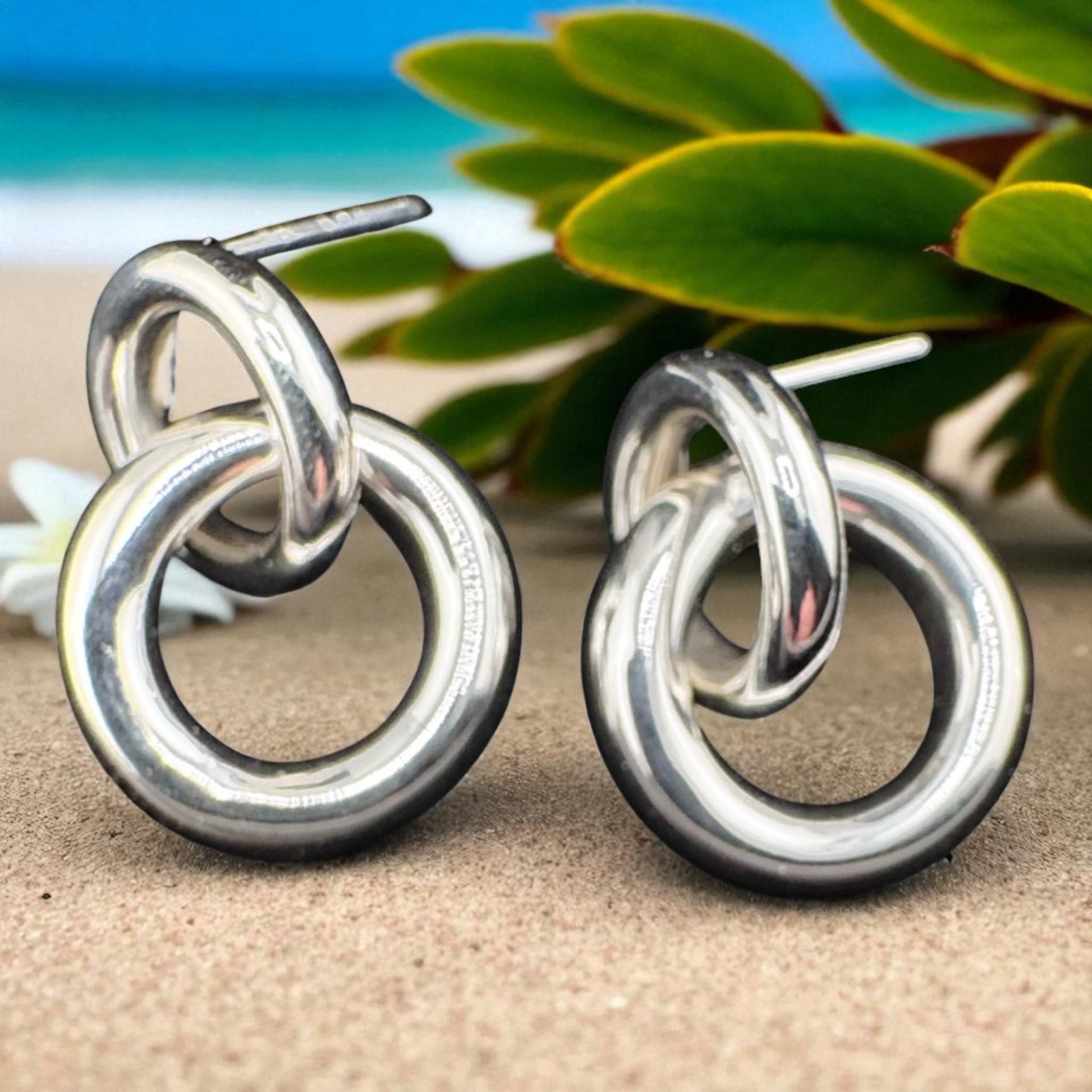 Elevate your everyday look with these Interlocking Round Stud Earrings. These captivating earrings feature two beautifully crafted round links, intertwined to create a subtle yet sophisticated design. Artisan crafted from solid .925 sterling silver, these earrings' gleaming details make them a chic and versatile accessory. Approx. 13mm x 23mm., Interlocking Round Stud Earrings, MVA-E002