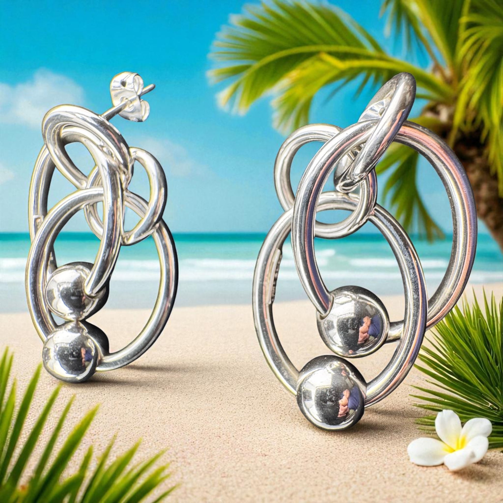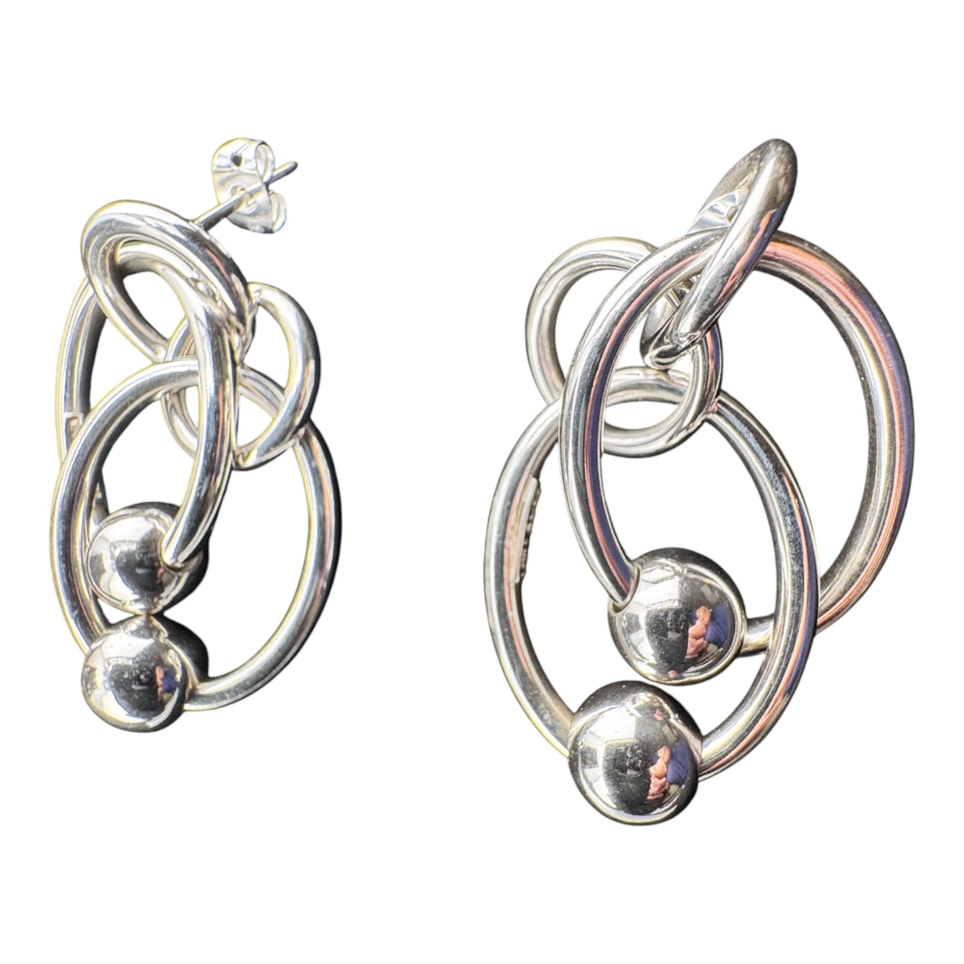 Discover playful elegance with these Interlocking Links w/Beads Stud Earrings. Featuring a dynamic arrangement of oval and round links, accented with polished silver beads, they create a unique and eye-catching design. Handcrafted from solid .925 sterling silver, with meticulous hand-finished details, they are a distinctive and versatile accessory. Approx. 20mm x 47mm., Interlocking Links w/Beads Stud Earrings, MVA-E007