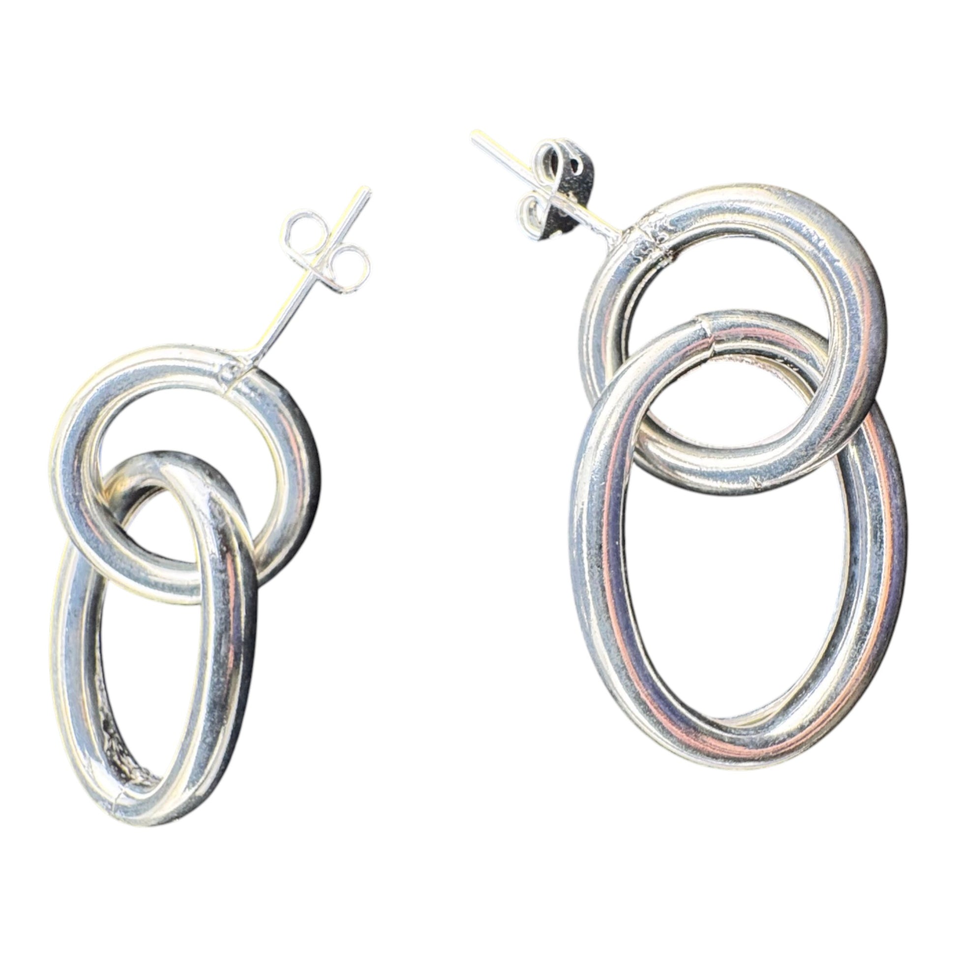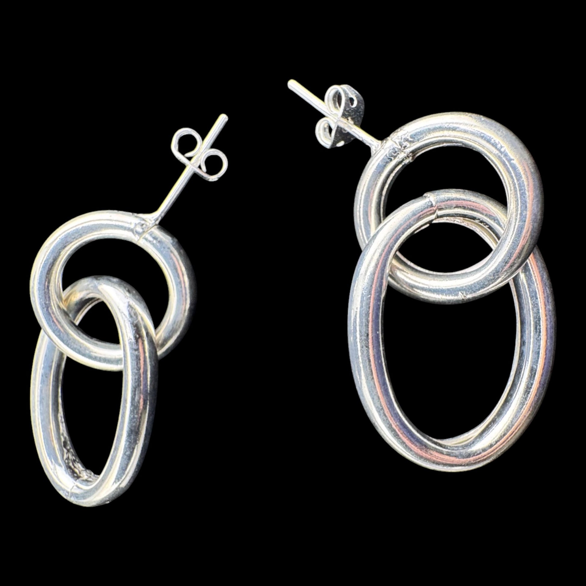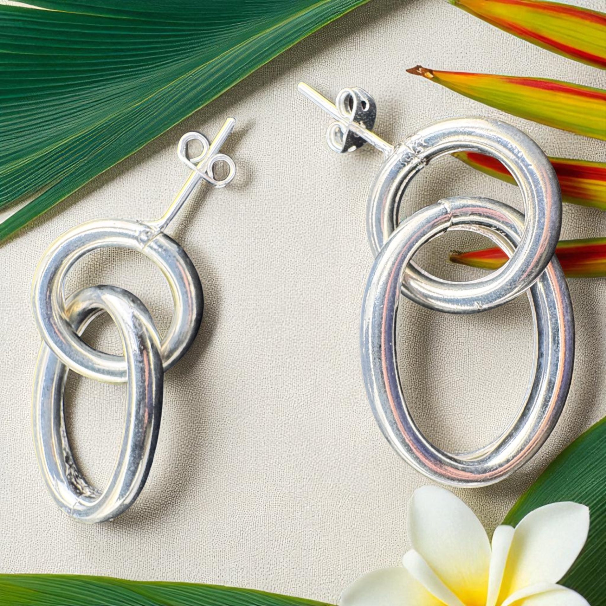 Embrace sleek sophistication with our exquisite Interlocking Ovals Stud Earrings. Featuring two beautifully crafted oval links, elegantly intertwined to create a minimalist yet striking design, all handcrafted from solid .925 sterling silver, these earrings boast meticulous hand-finished details, making them a chic and versatile accessory. Approx. 22mm x 40mm., Interlocking Ovals Stud Earrings, MVA-E008